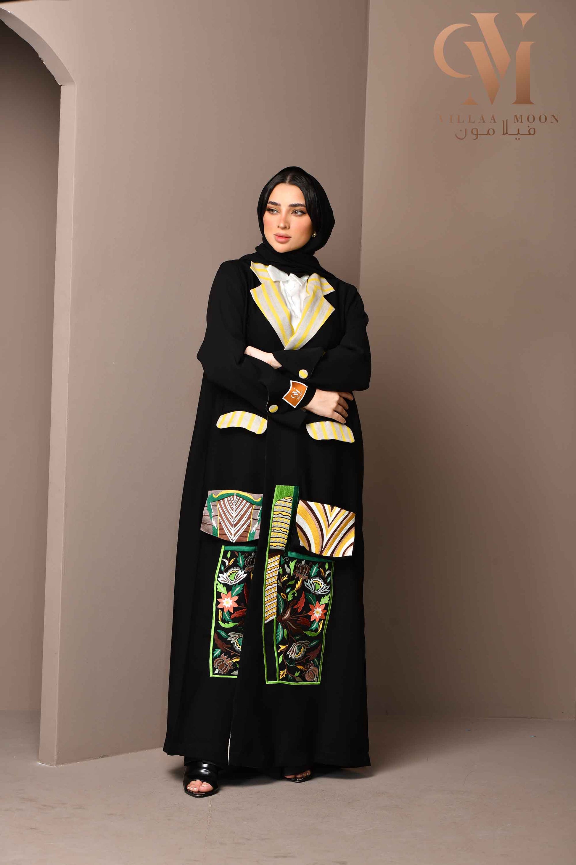 ذو جيوب من نفس القماش مع تطريز لوحه فنية في الجهة السفلية من الجيوب وحتى المنتصف الأخير من الجاكيت