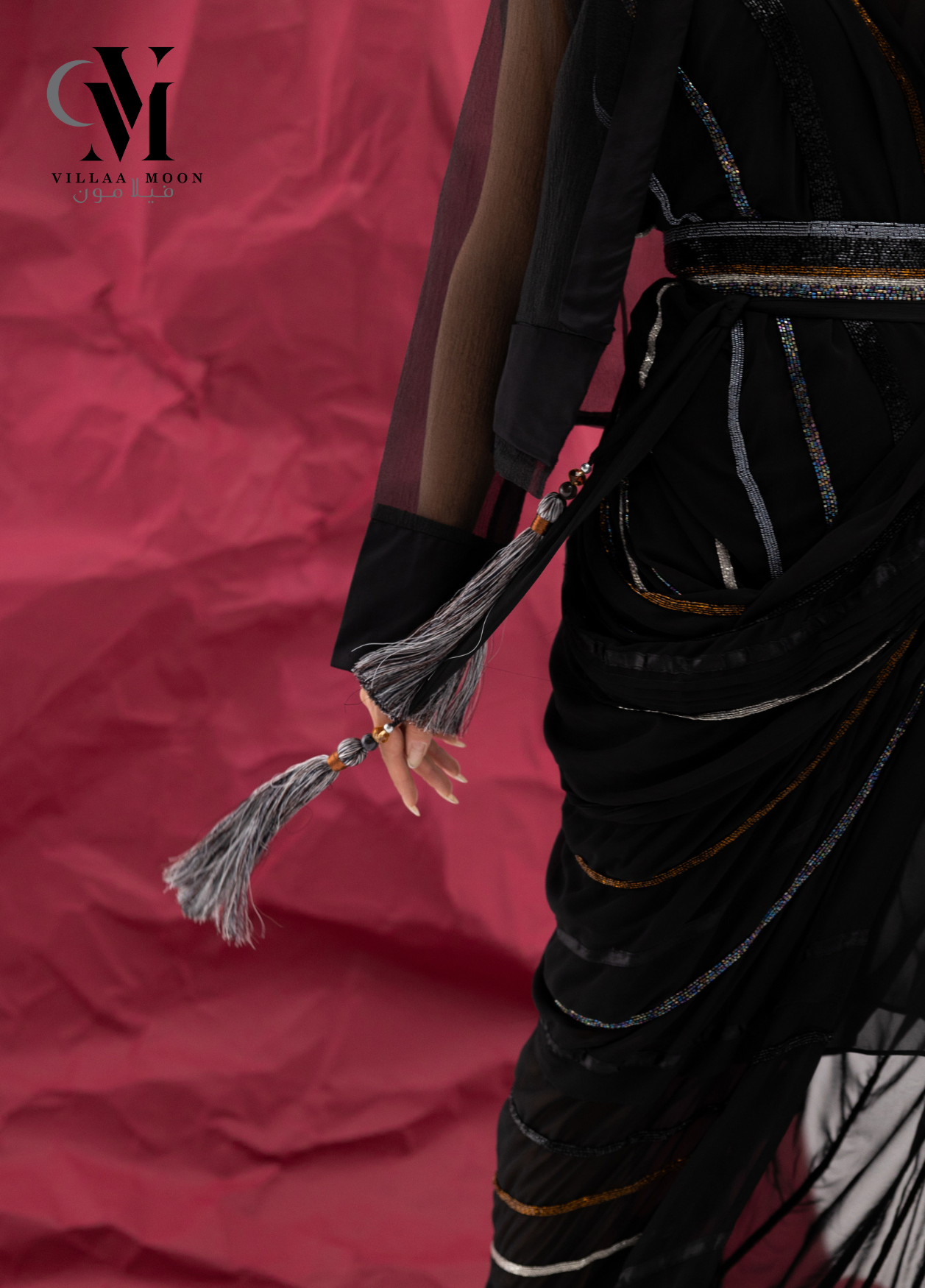 عباره عن فستان لف من قماش الجورجيت الفرنسي المشغول باليد مع الشرايط الحرير بموديل لف مع حزام مشكوك وبطانه قصيره وجاكيت أسود أورغنزا