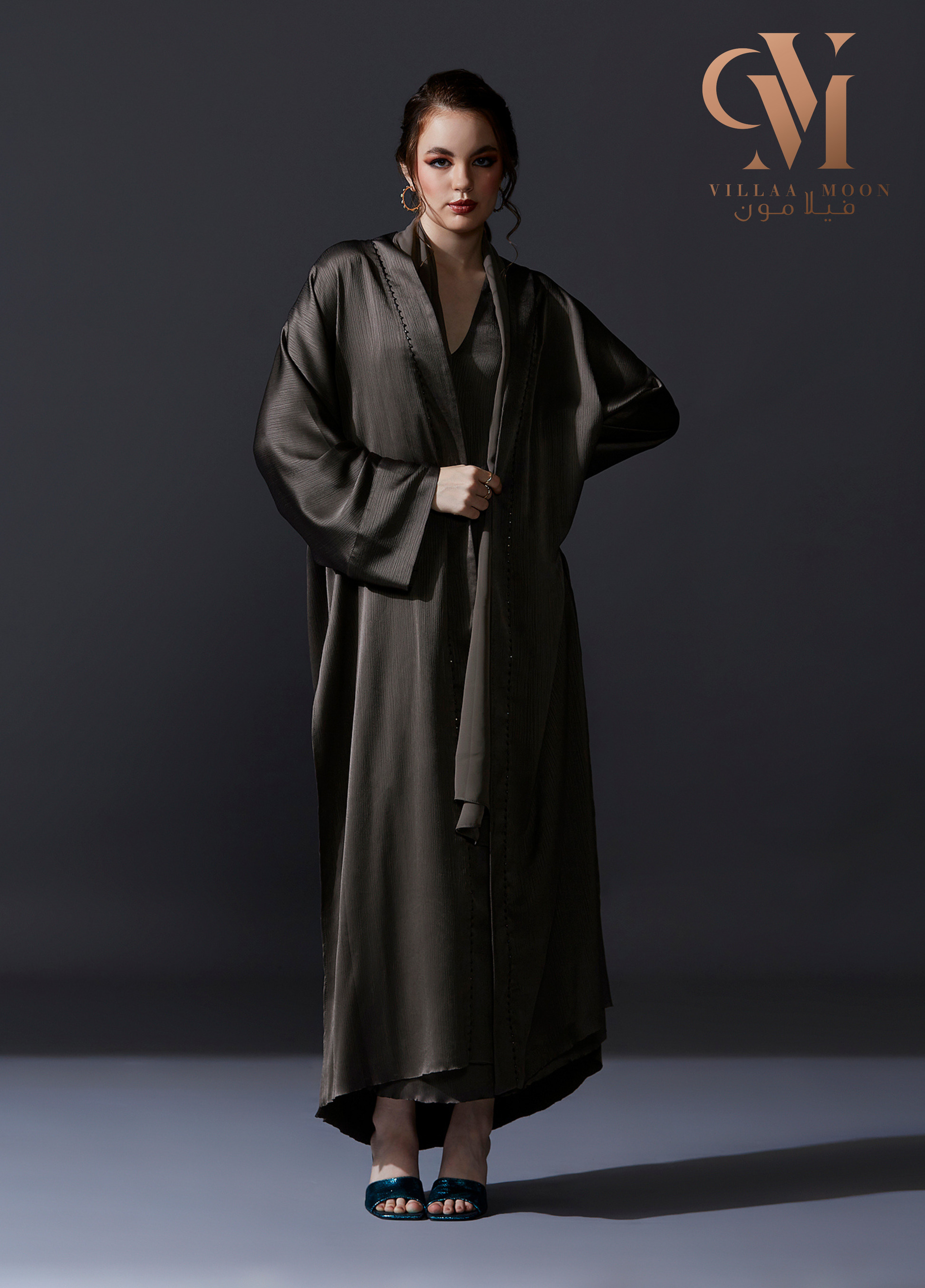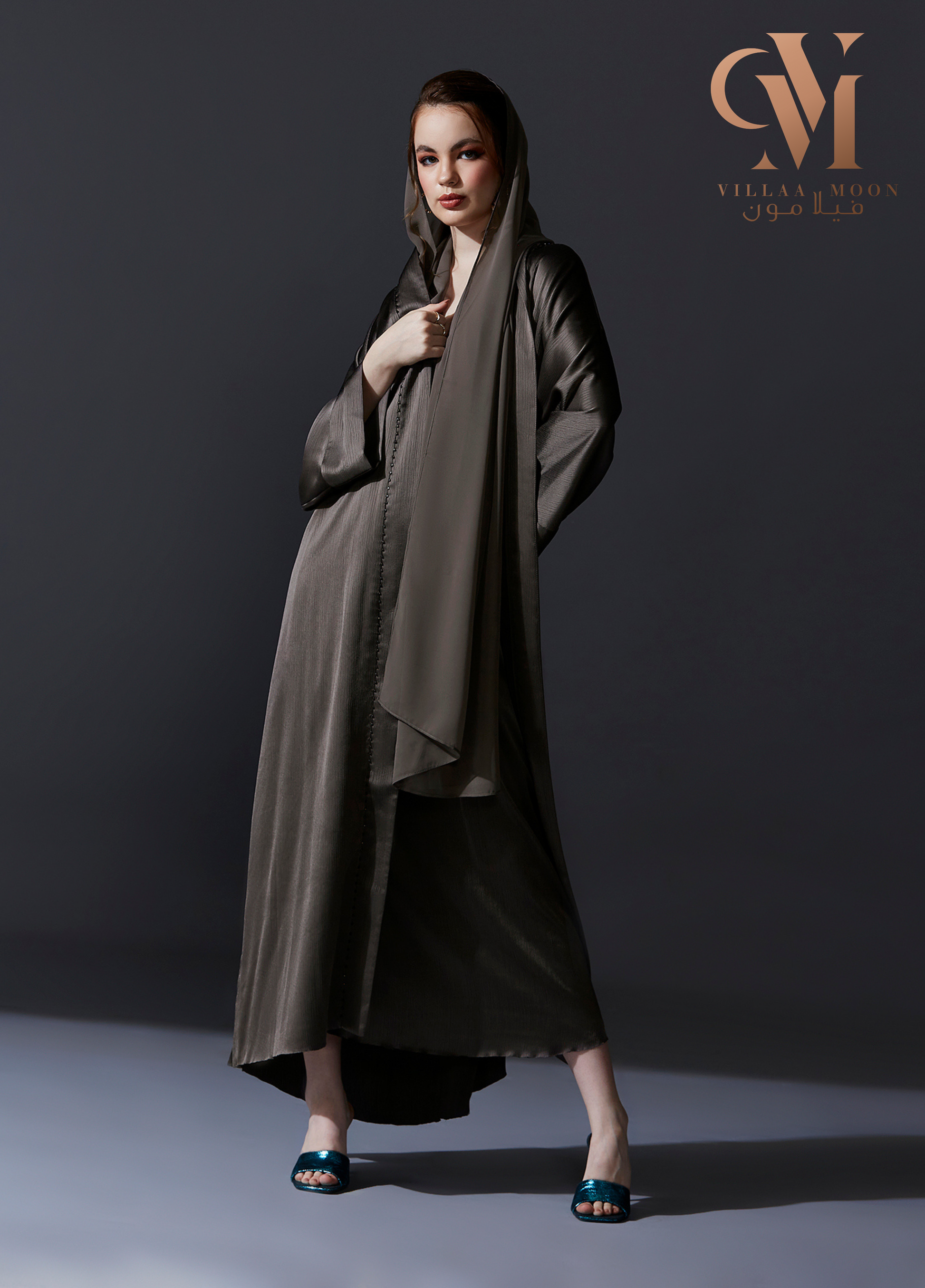 قطعتين فستان داخلي وجاكيت ذو قصه وموديل مريح يخلط بين الموديل الياباني والمودرن ولإضافة شي من الاناقة والفخامه تم تطريز الاطراف بالنمنم مع ملفع حرير شيفون نفس اللون