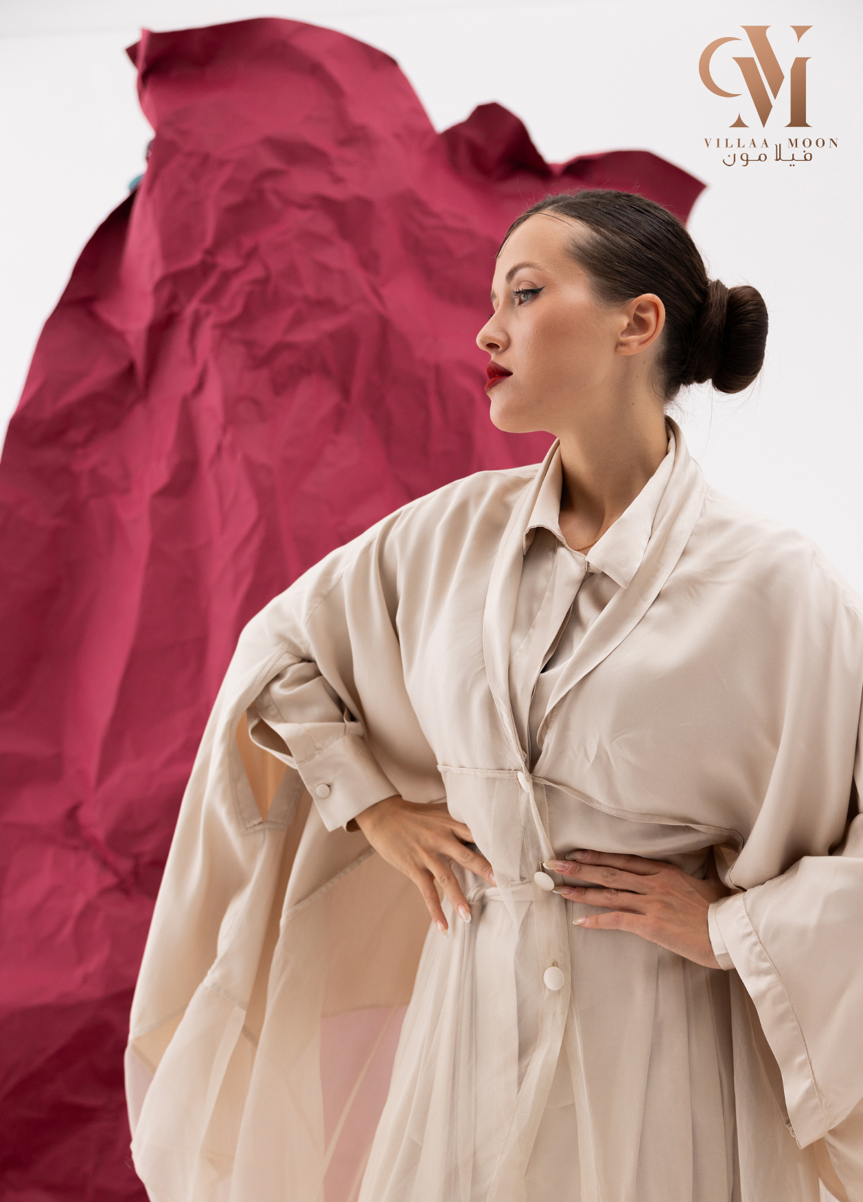 عباره عن جيمسوت حرير بإزرة امامية وحزام فاخر مع كيب حرير اورجنزا وملفع شيفون حرير