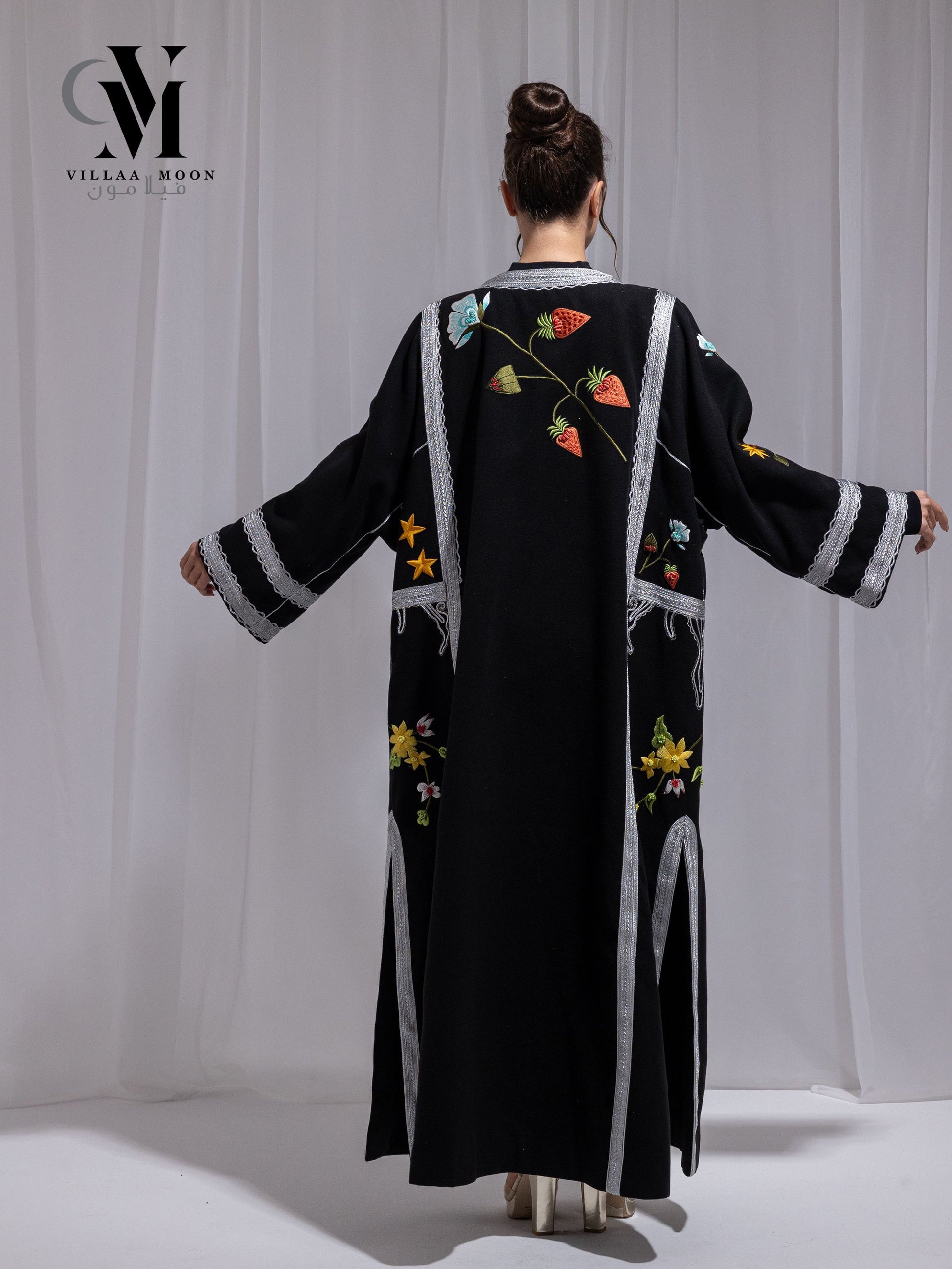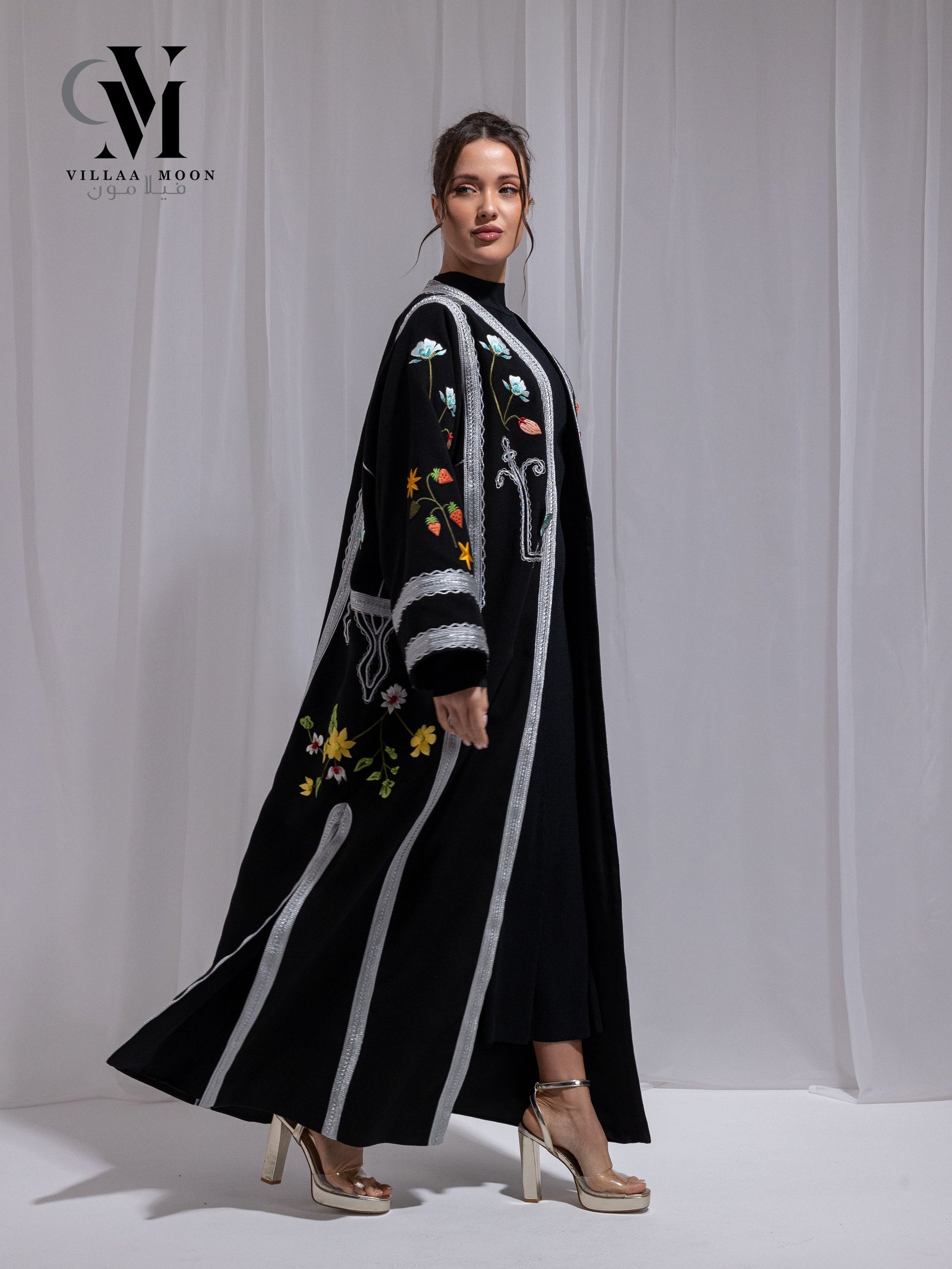 بشت جوخ اسود مطرز بالخيوط السلك الفضي الزري مع تطريز وشك بارز بتصميم الورود والتوت