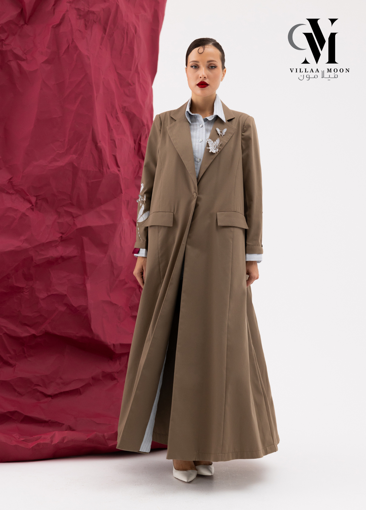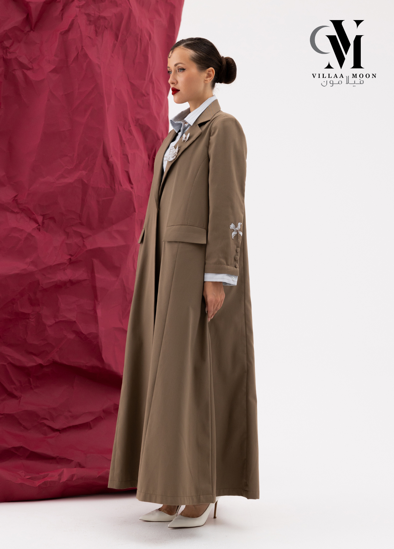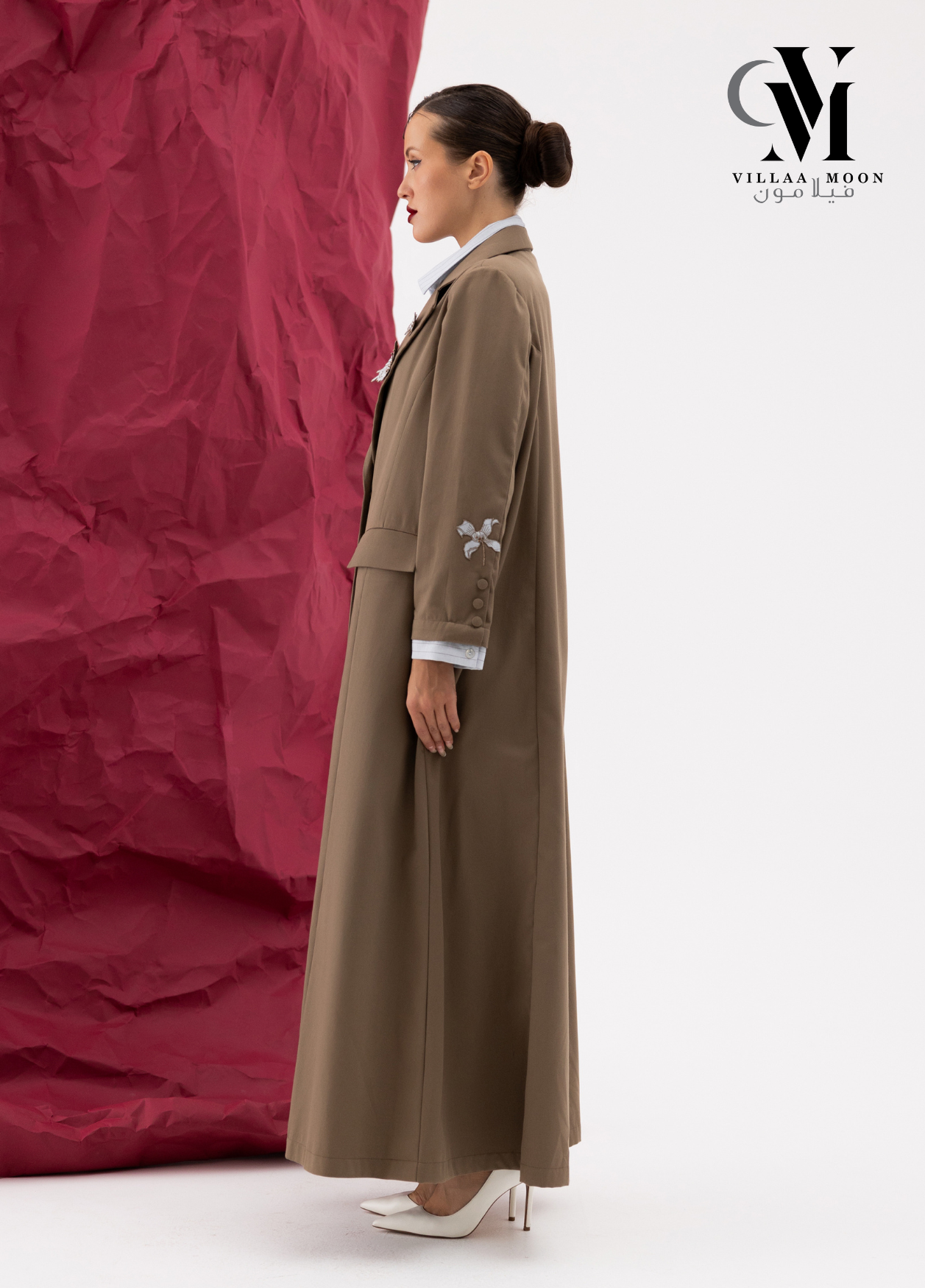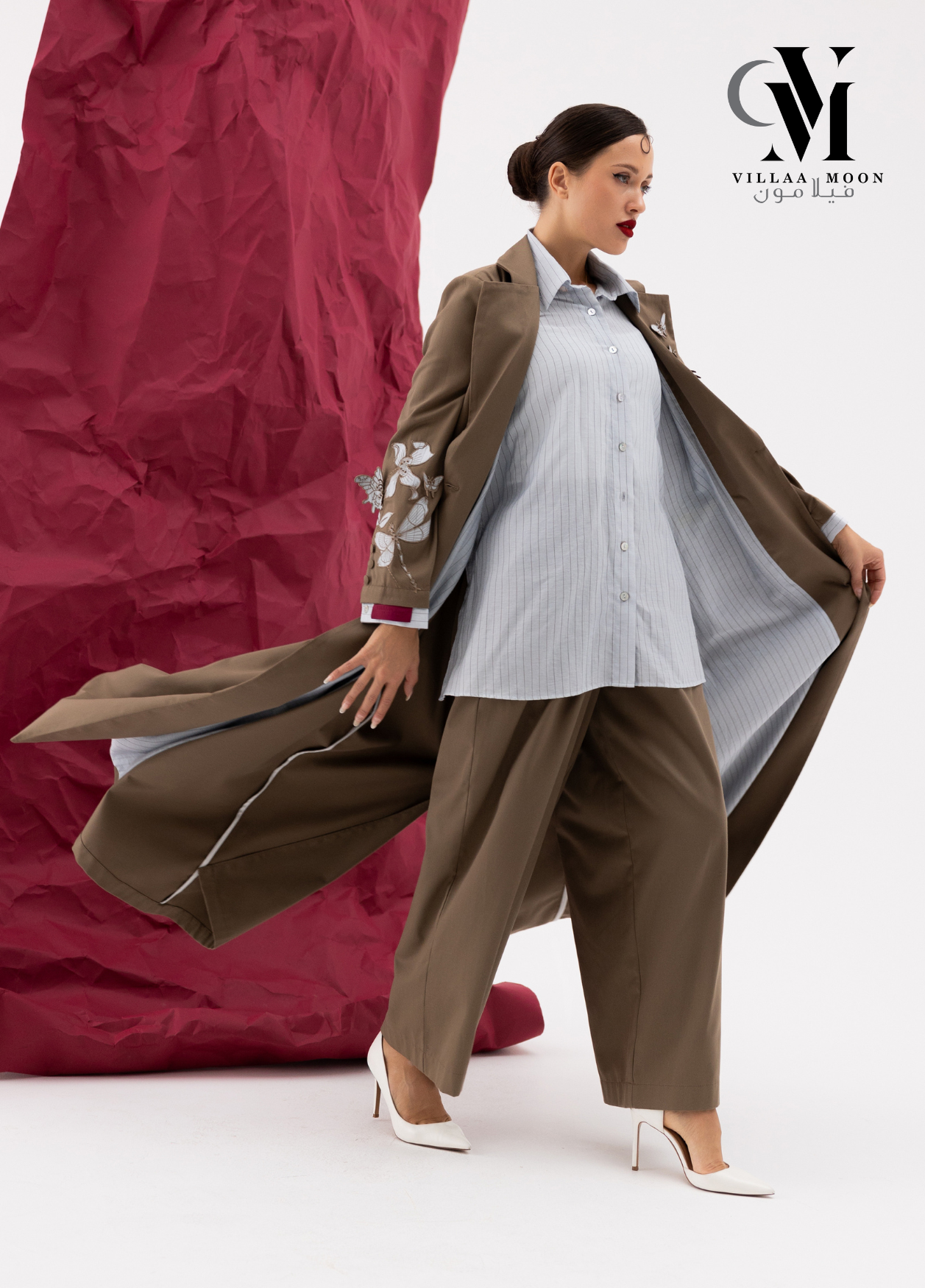 عباره عن جاكيت من قماش الكريب القطن ذو اللون البيج مطرز بأشكال ثلاثية الأبعاد مع قماش فاخر فرنسي للبطانة الداخلية والقميص المركب مثبت به ، مع بنطلون وملفع نفس لون الجاكيت