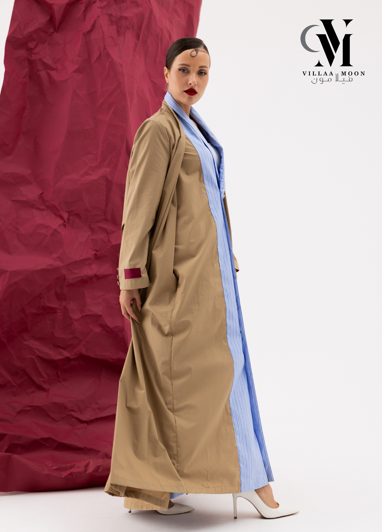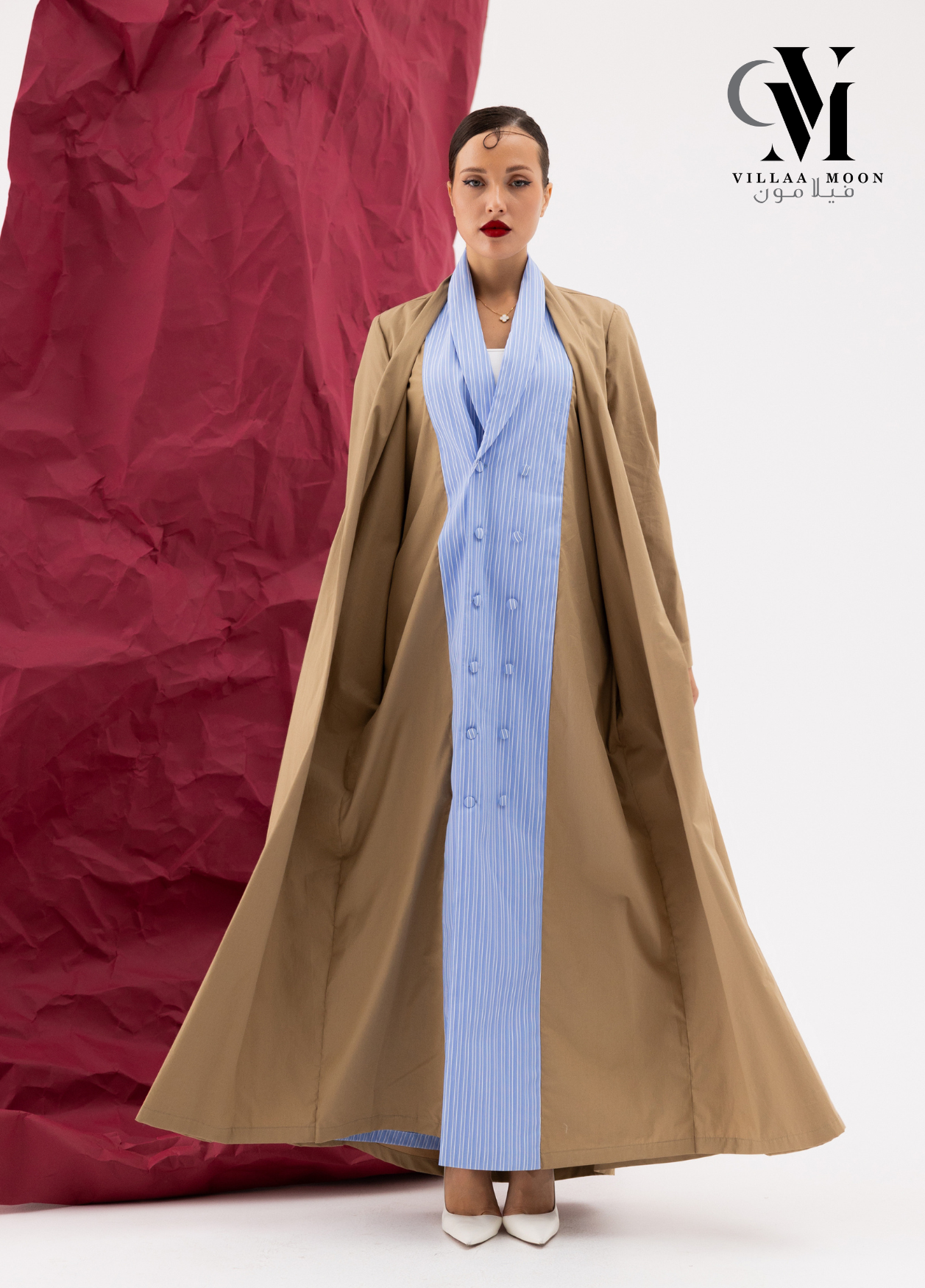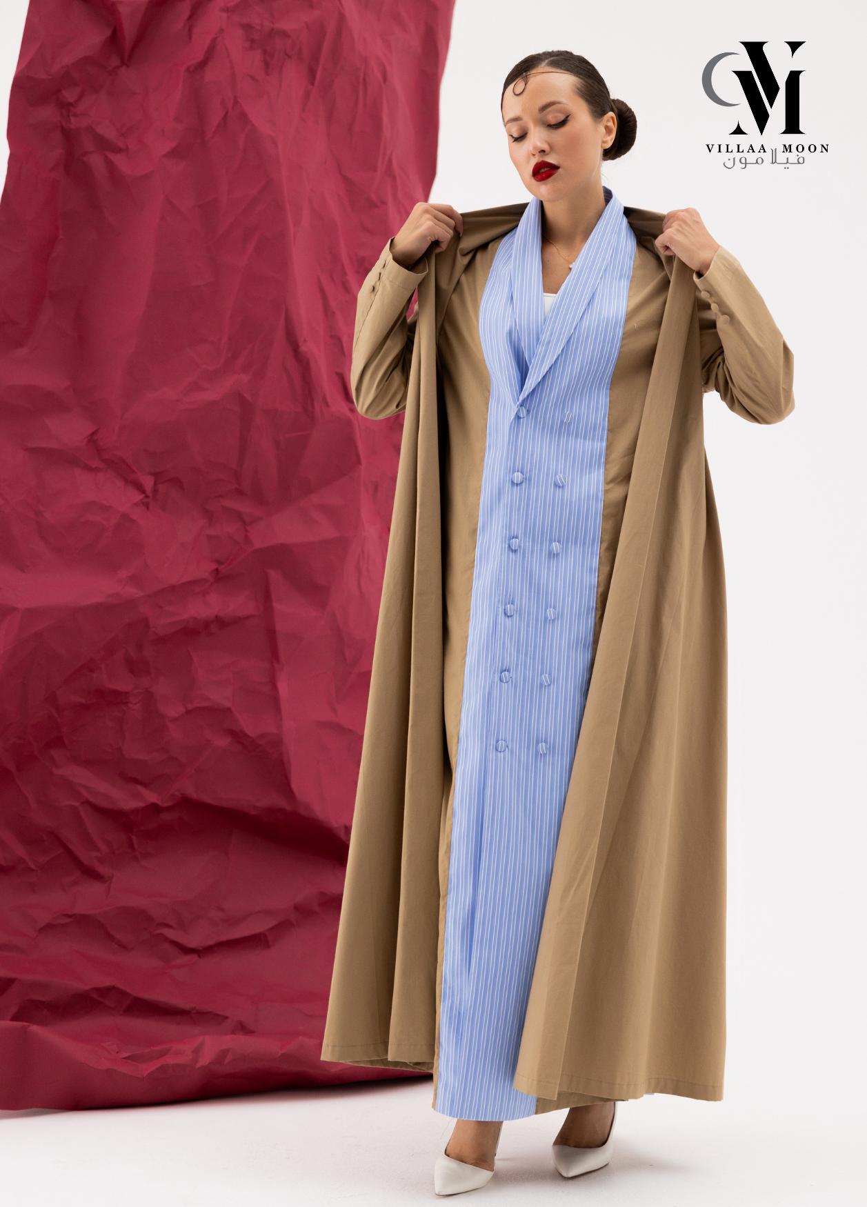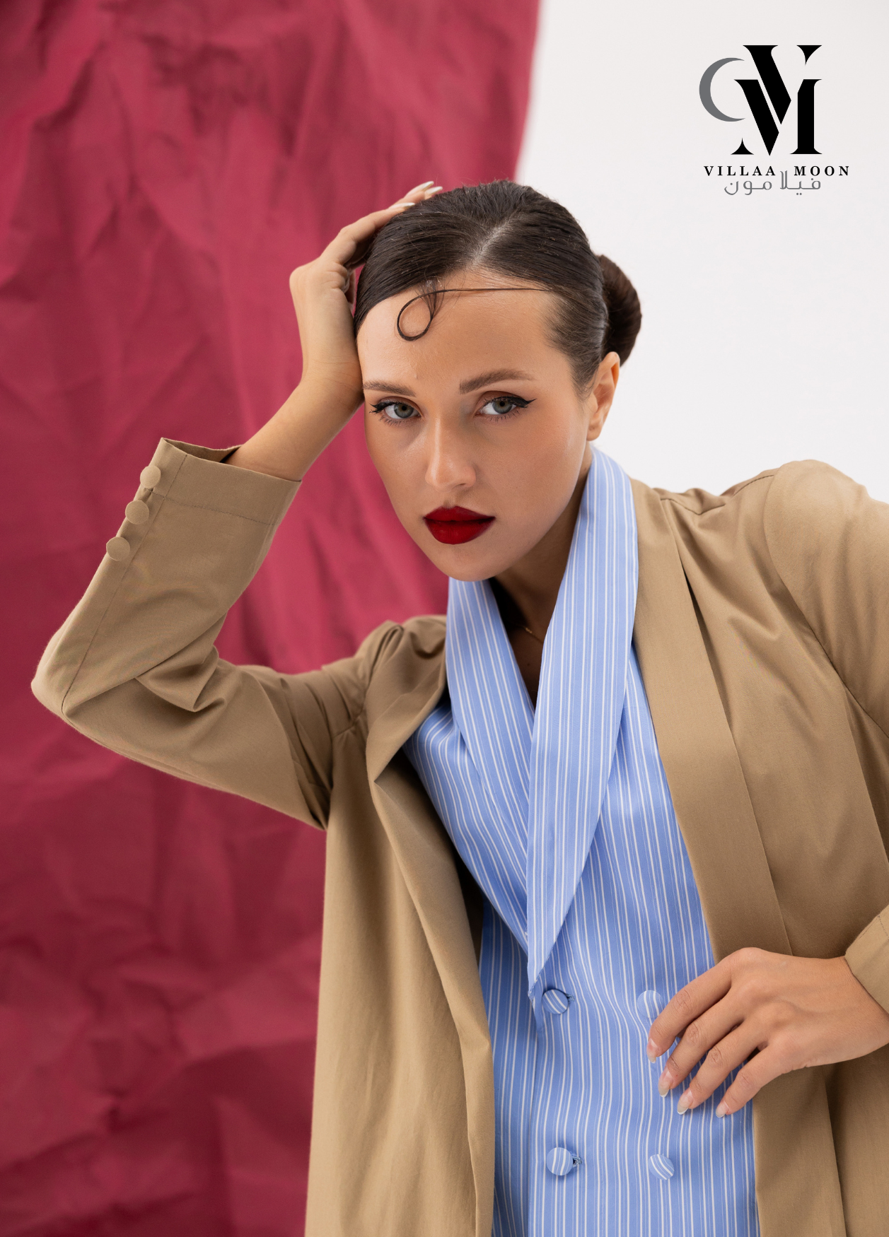 عباره عن جاكيت من قماش الكريب الفرنسي مبطن بقماش القطن الفرنسي المقلم باللون الأزرق الفاتح والأبيض ، ذو موديل حديث مع ملفع شيفون ذو اللون البيج
