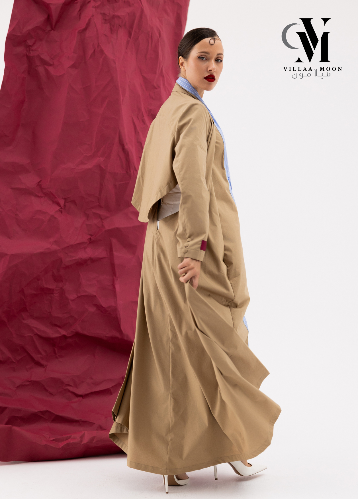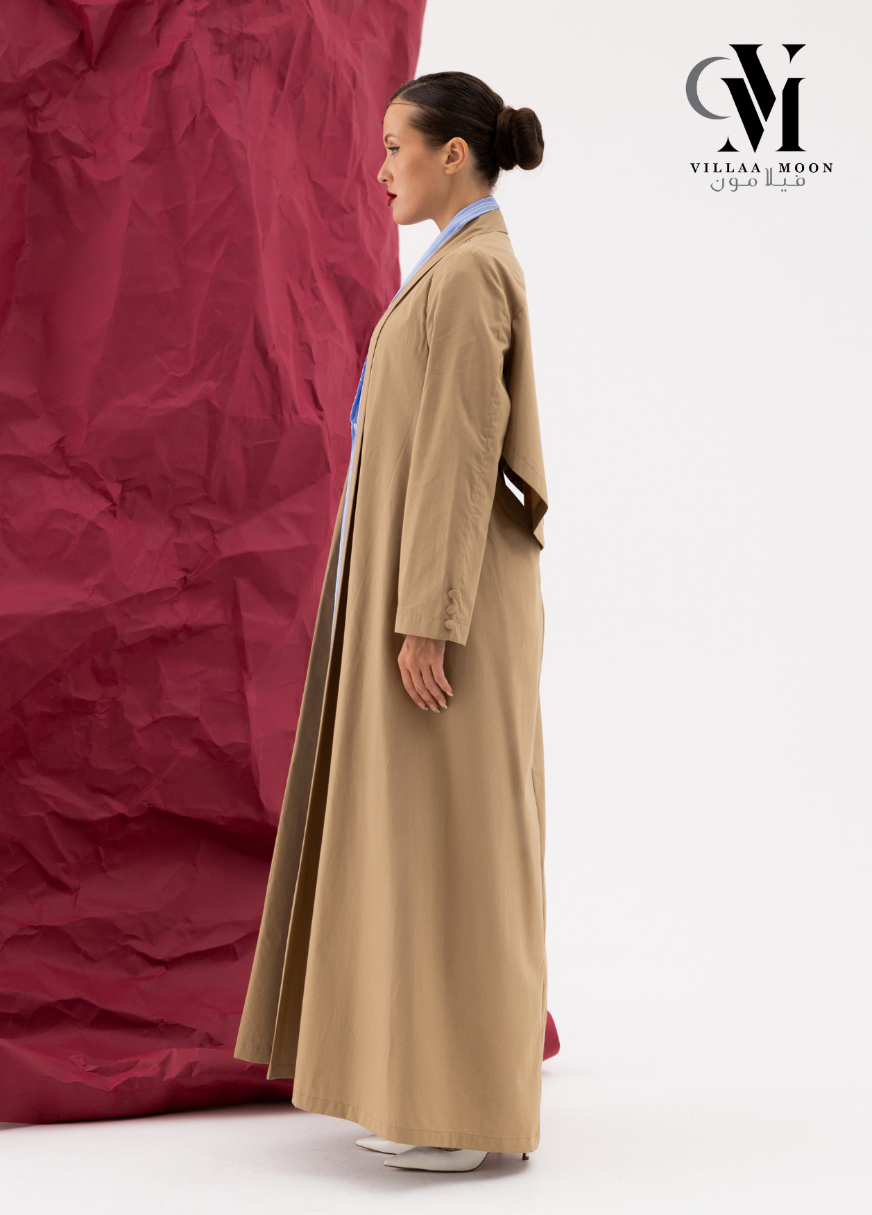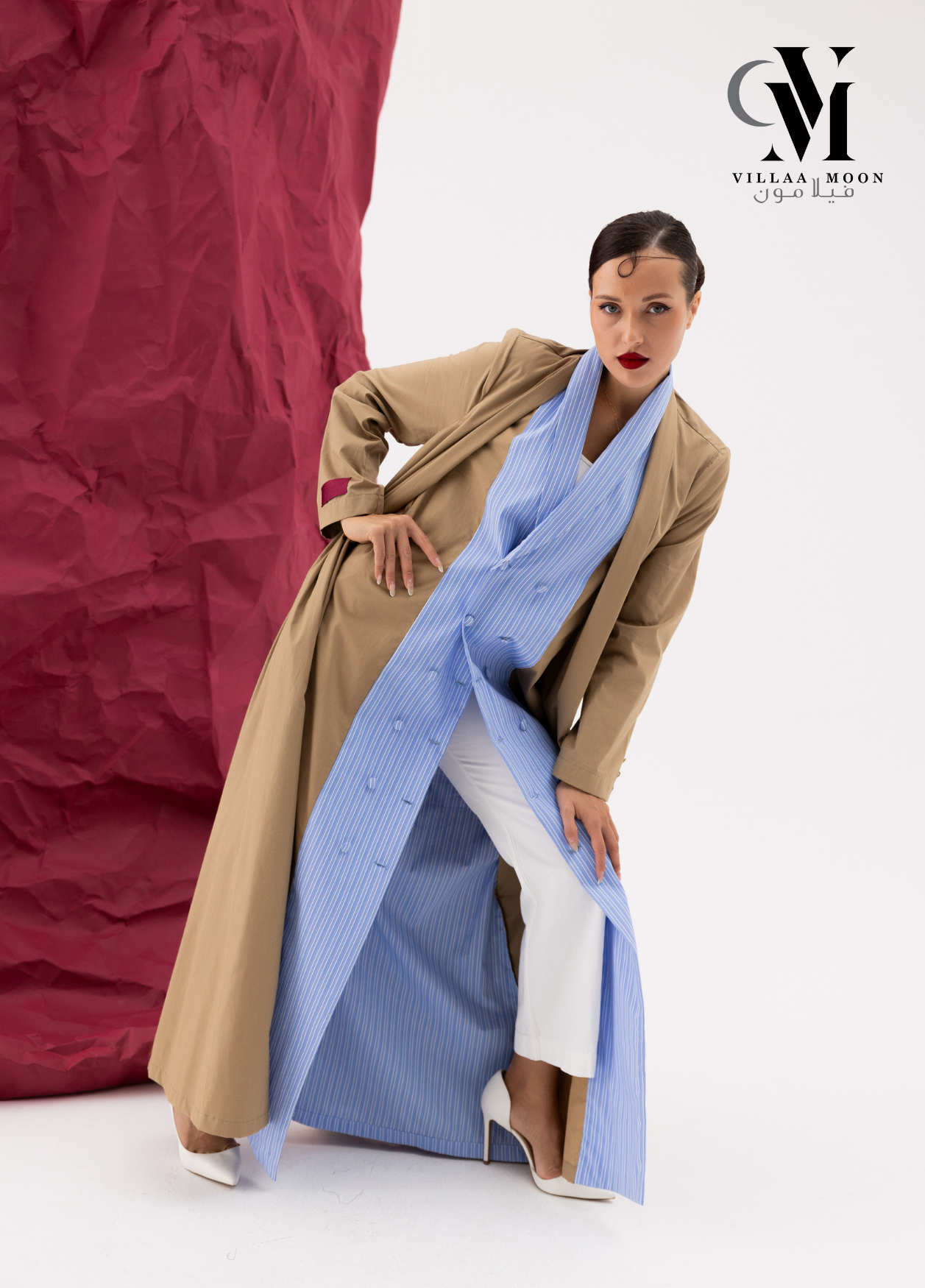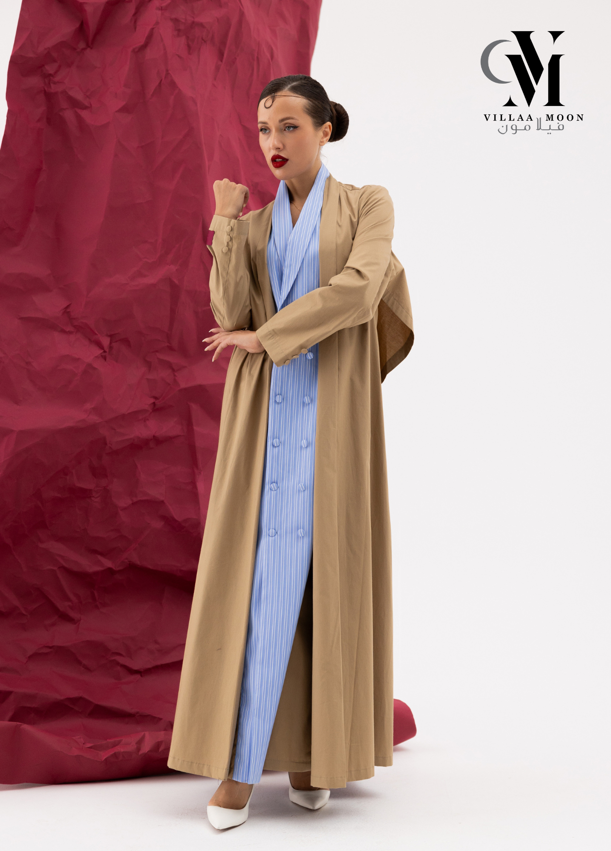 عباره عن جاكيت من قماش الكريب الفرنسي مبطن بقماش القطن الفرنسي المقلم باللون الأزرق الفاتح والأبيض ، ذو موديل حديث مع ملفع شيفون ذو اللون البيج