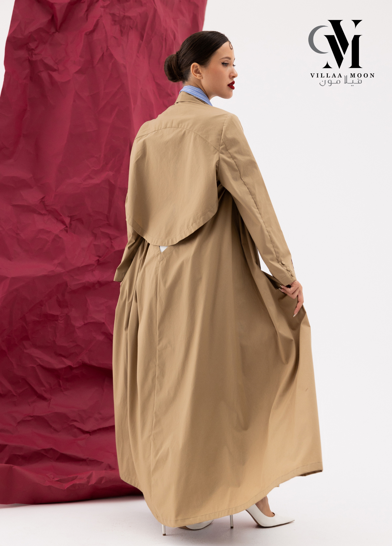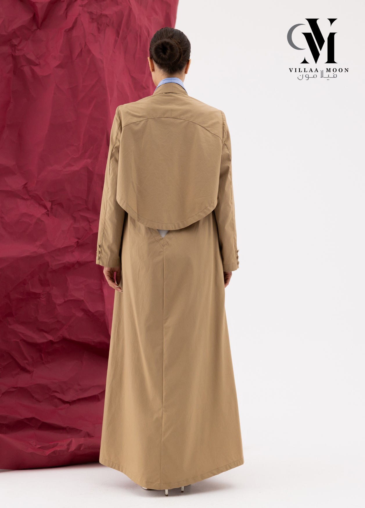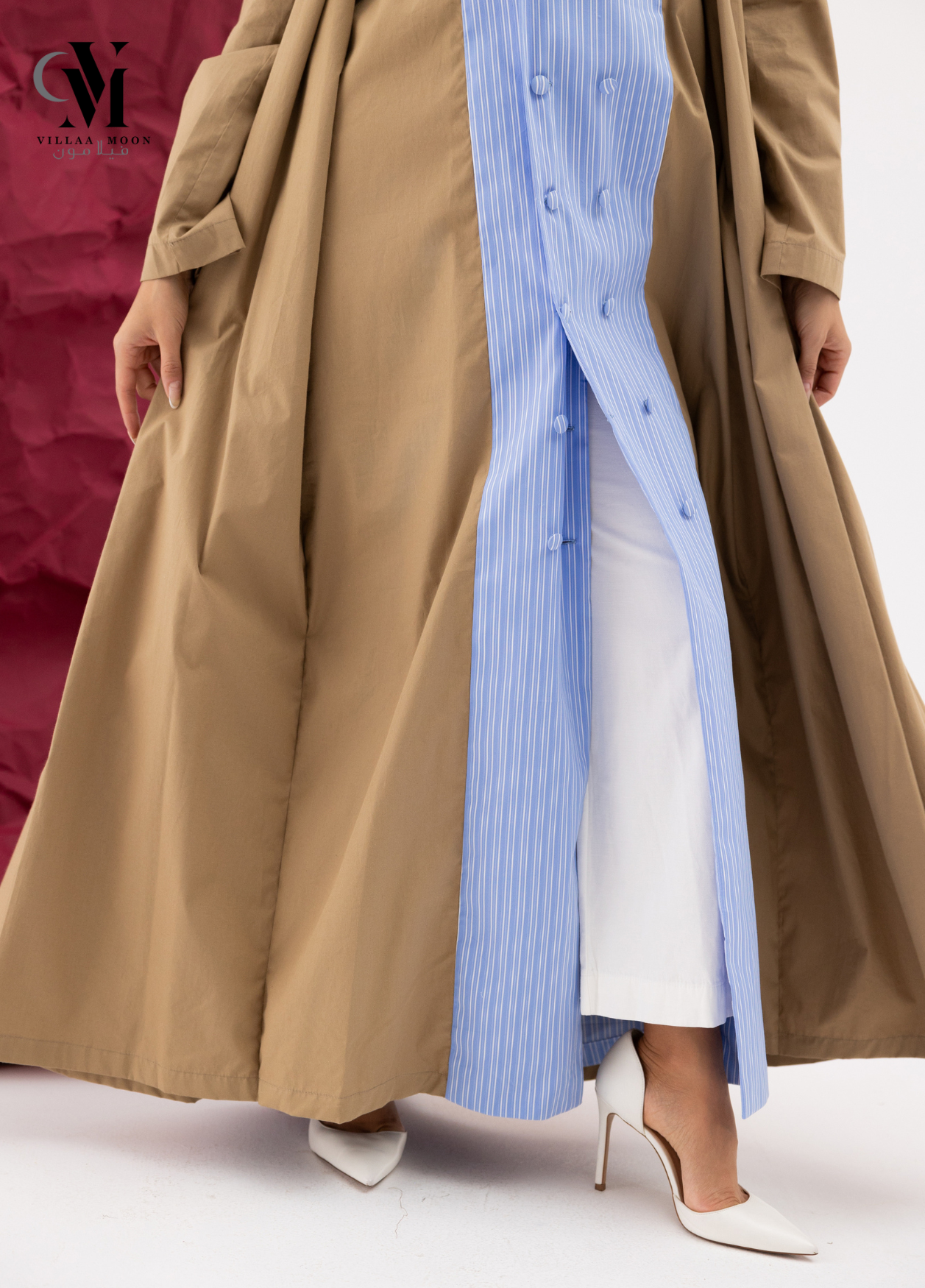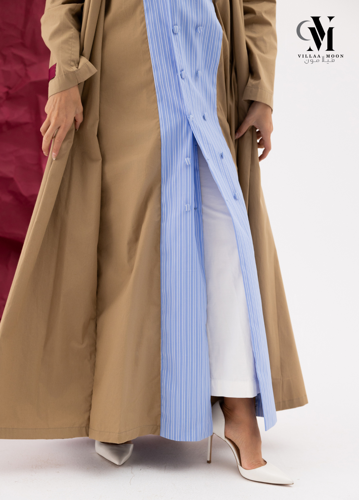 عباره عن جاكيت من قماش الكريب الفرنسي مبطن بقماش القطن الفرنسي المقلم باللون الأزرق الفاتح والأبيض ، ذو موديل حديث مع ملفع شيفون ذو اللون البيج