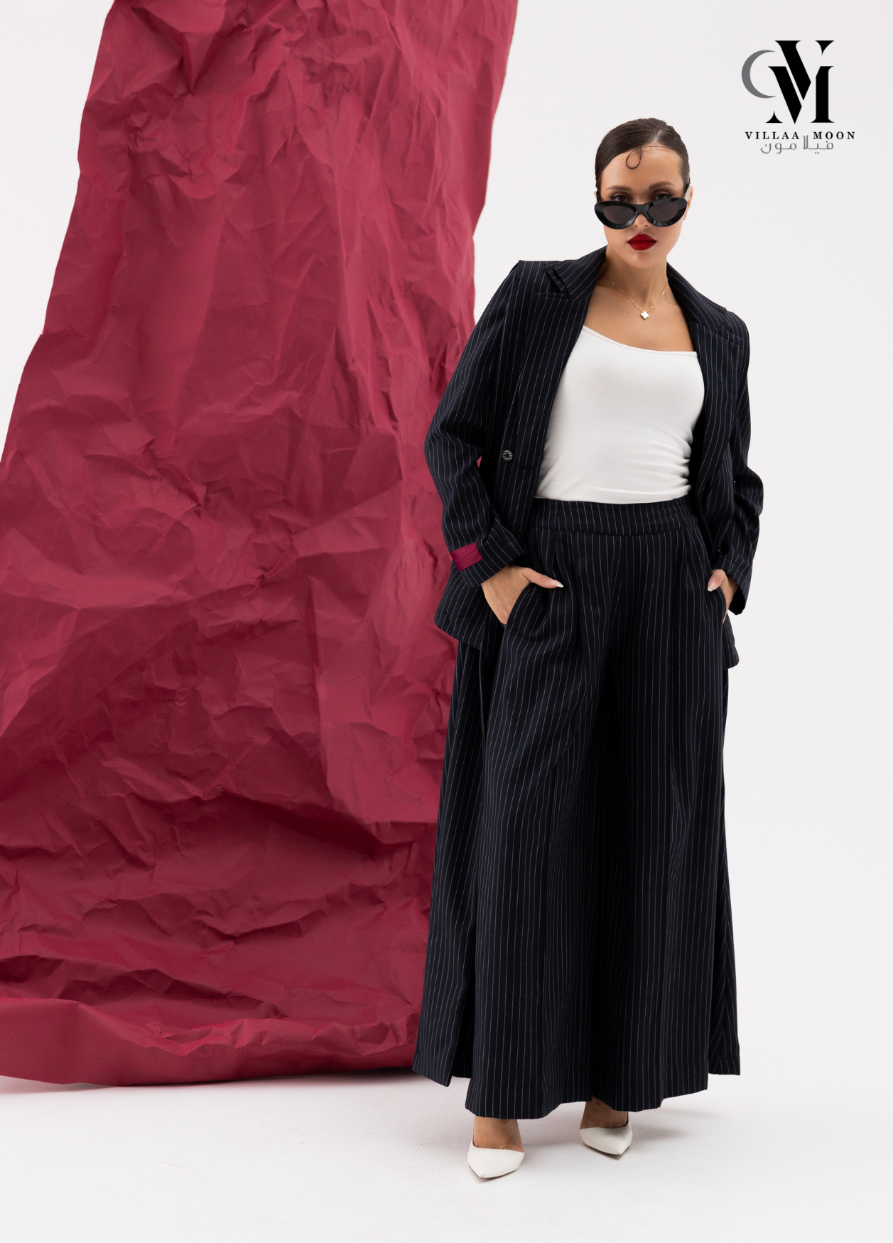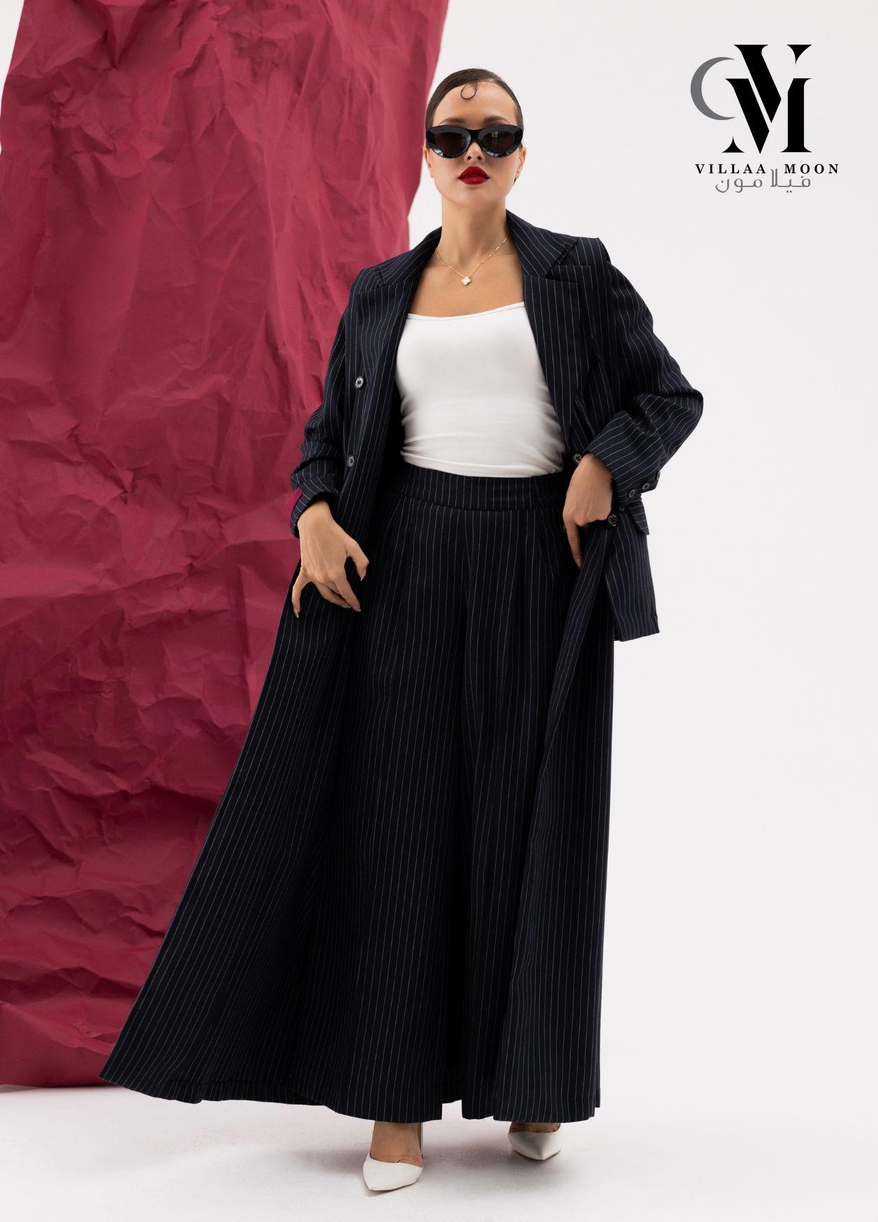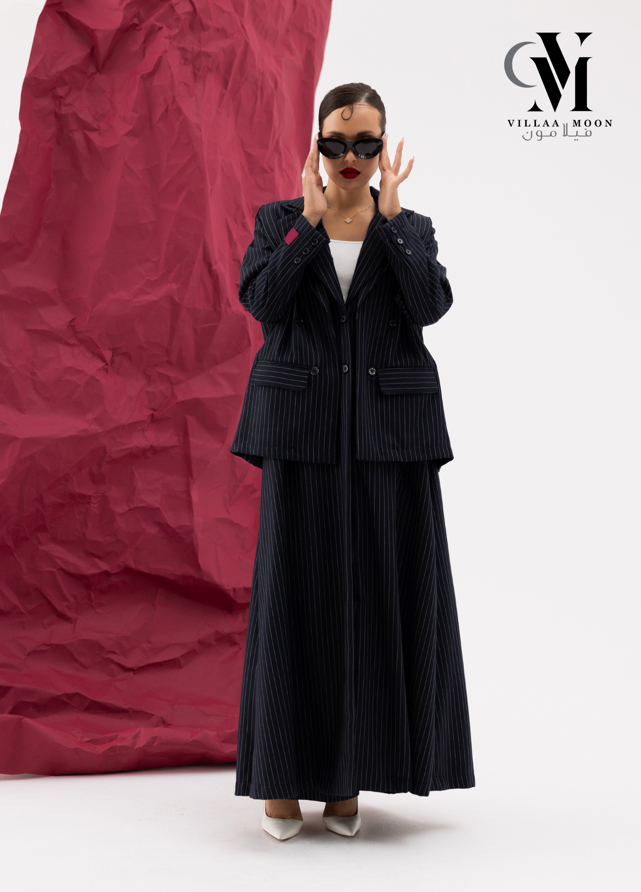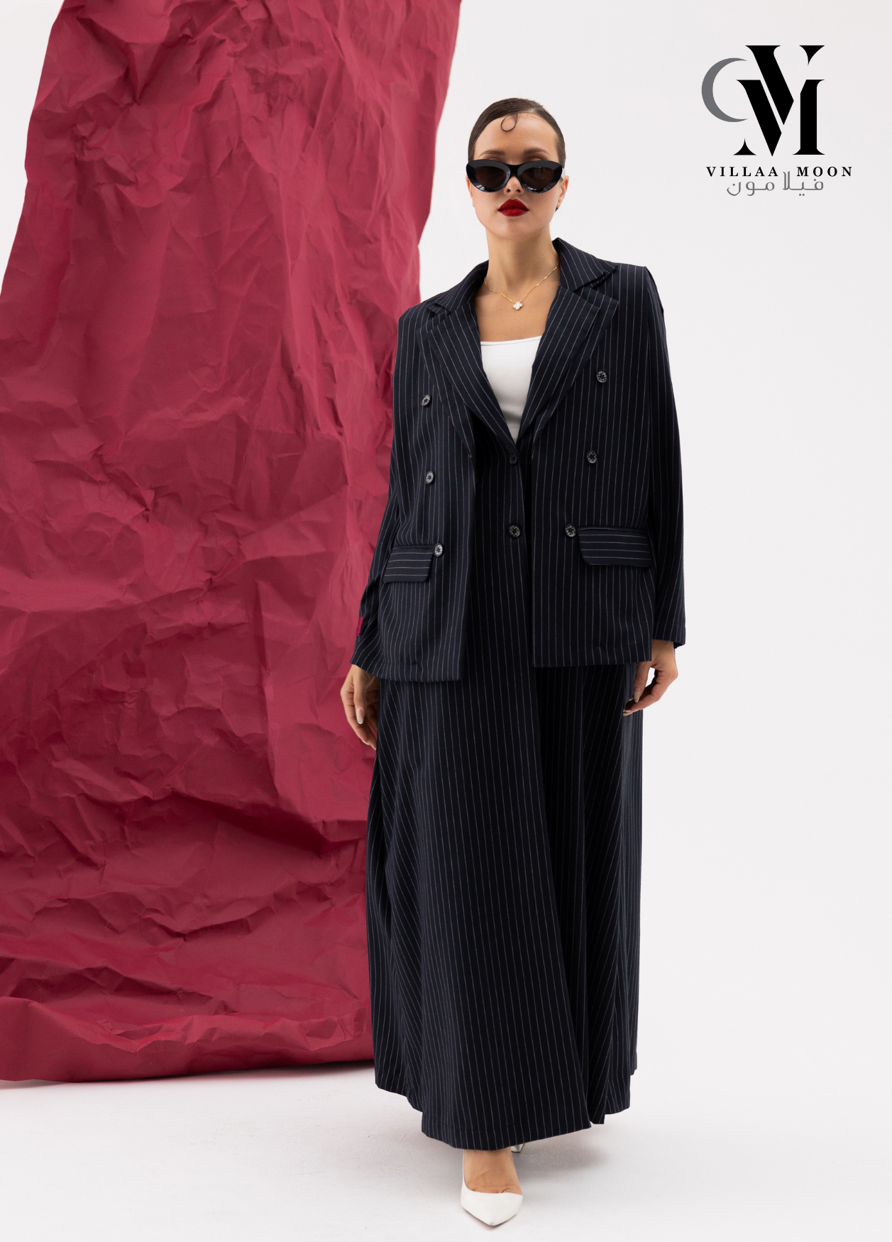 عباره عن جاكيت دبل من قماش الكريب القطن المقلم باللون الكحلي والاوفوايت مع بنطلون وملفع شيفون