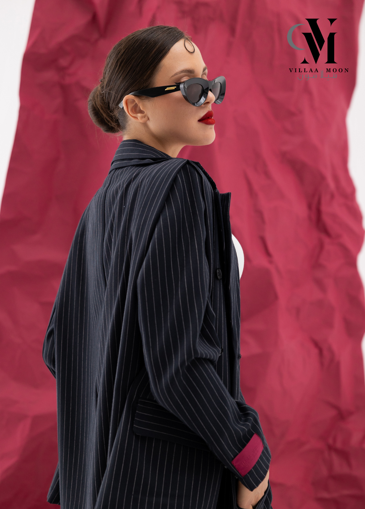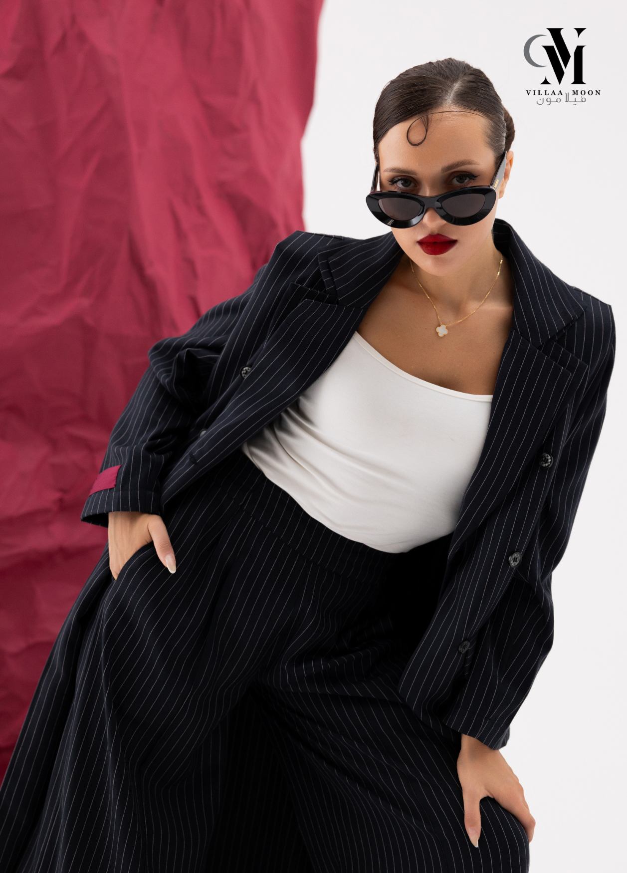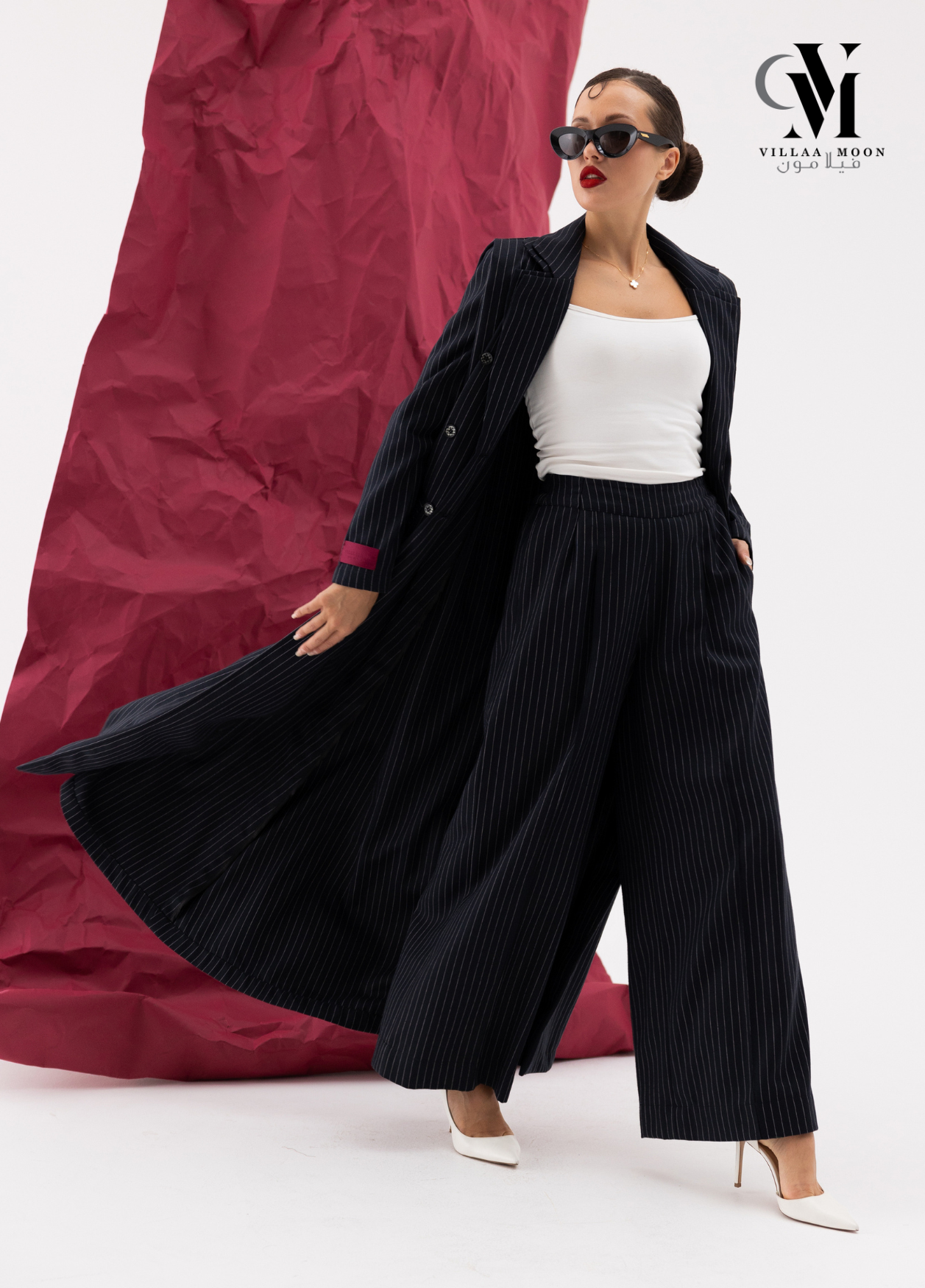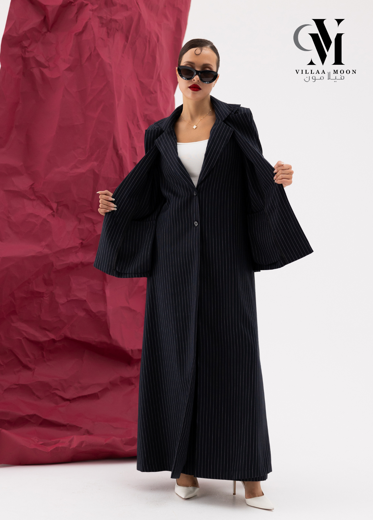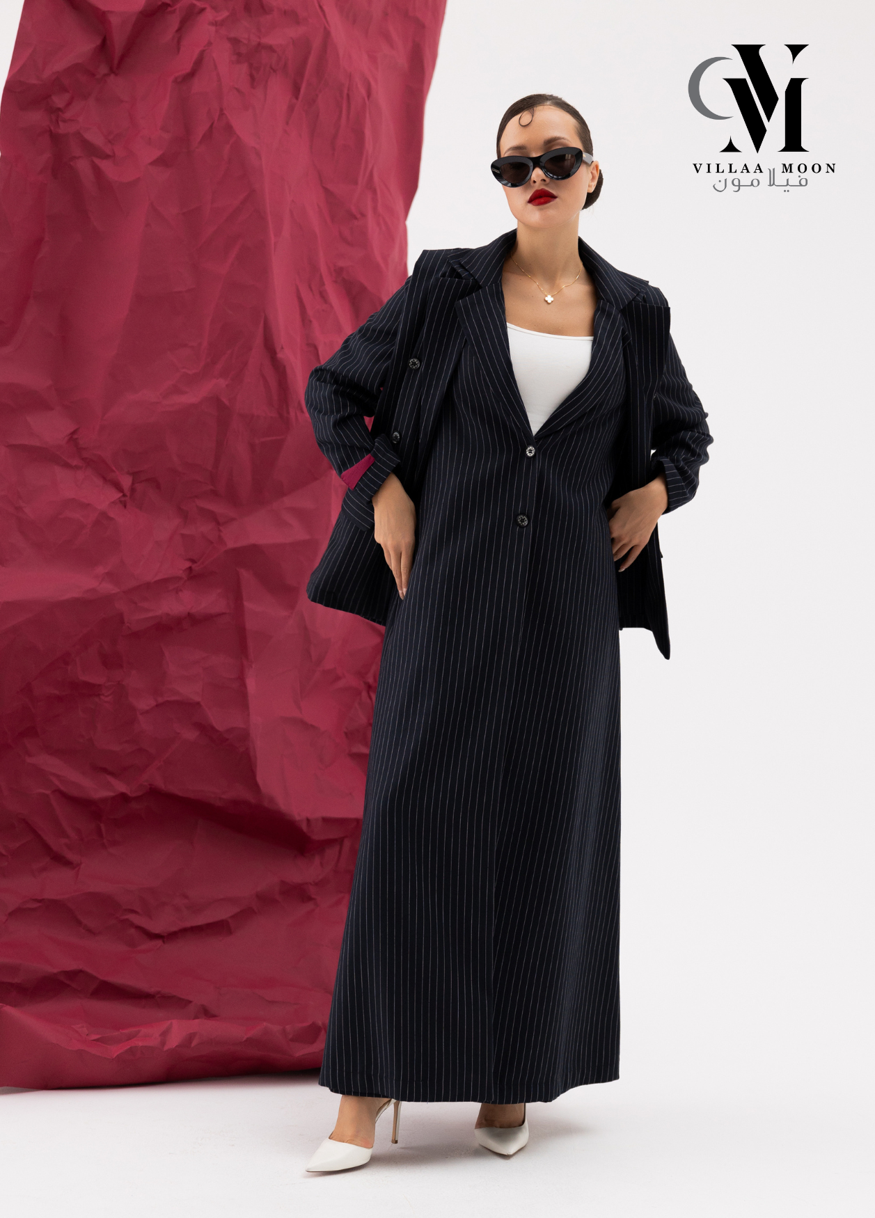 عباره عن جاكيت دبل من قماش الكريب القطن المقلم باللون الكحلي والاوفوايت مع بنطلون وملفع شيفون