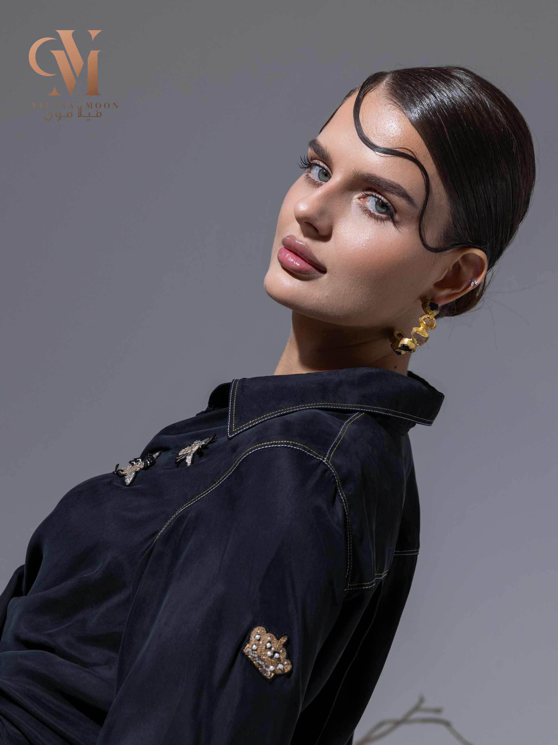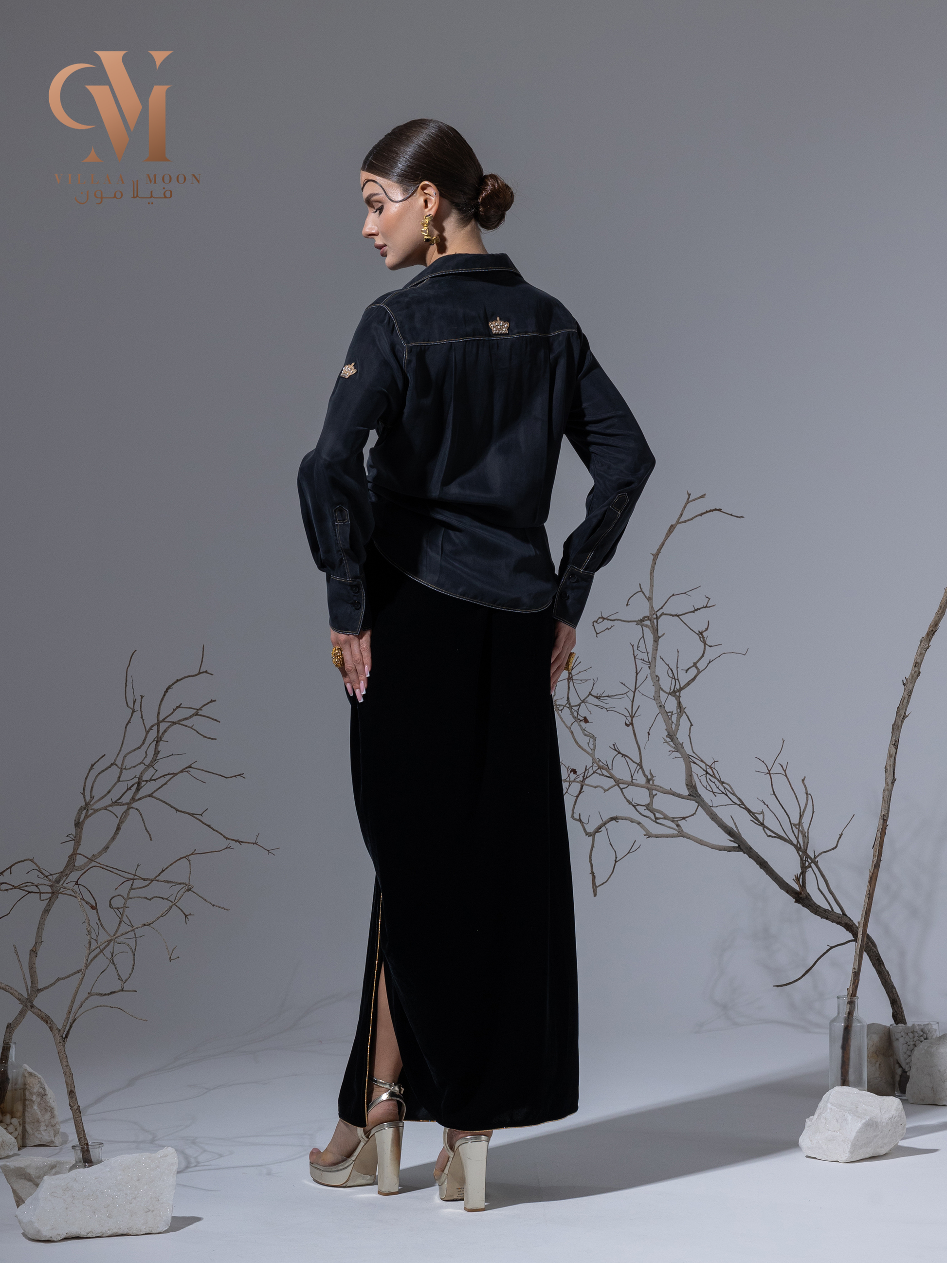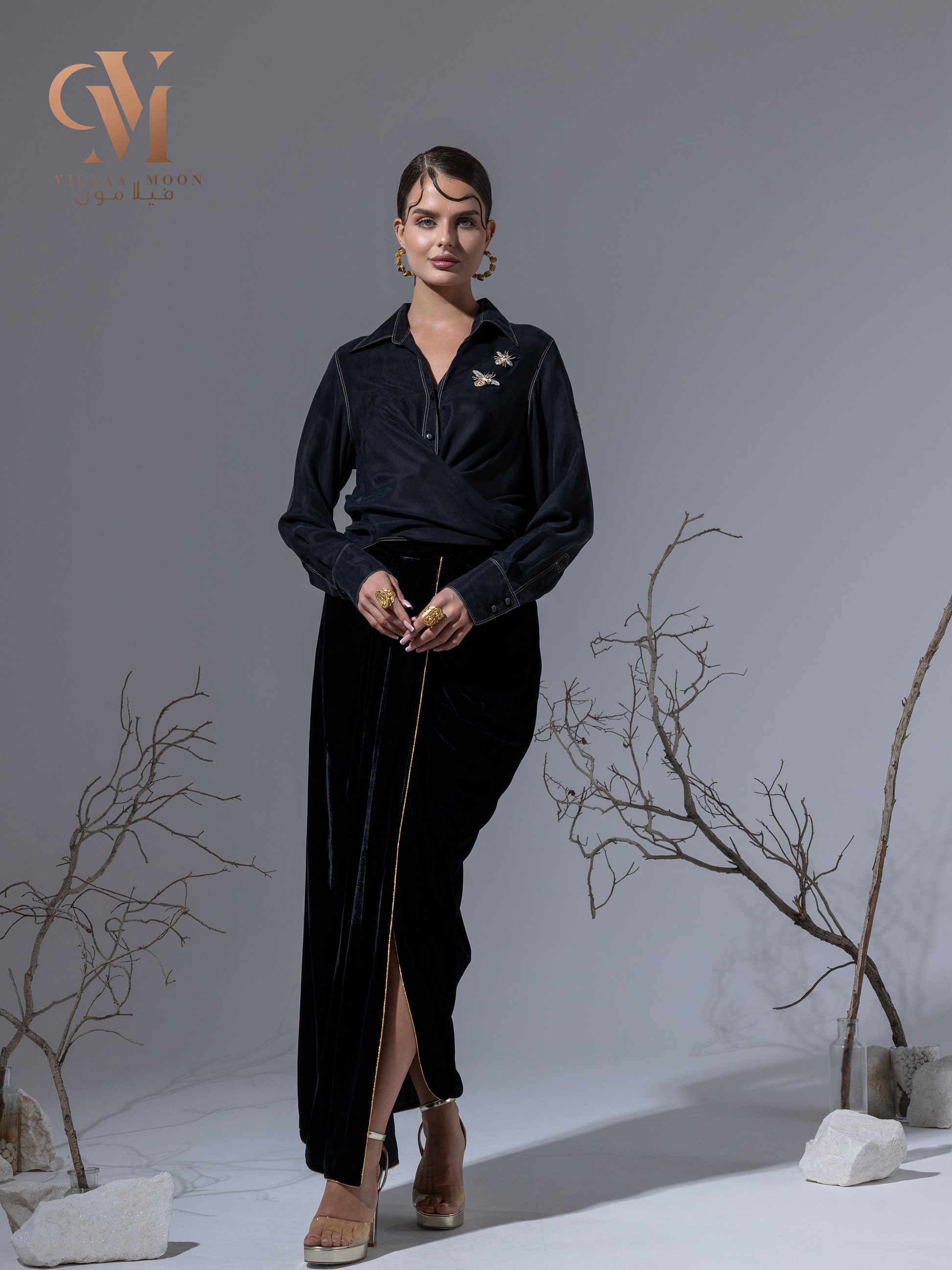 بدله قطعتين قميص لف من الحرير المغسول عليه تطريز مكينه بالخيط الذهبي والفضي وشك خاص (بتر فلاي) وتاج وتنوره