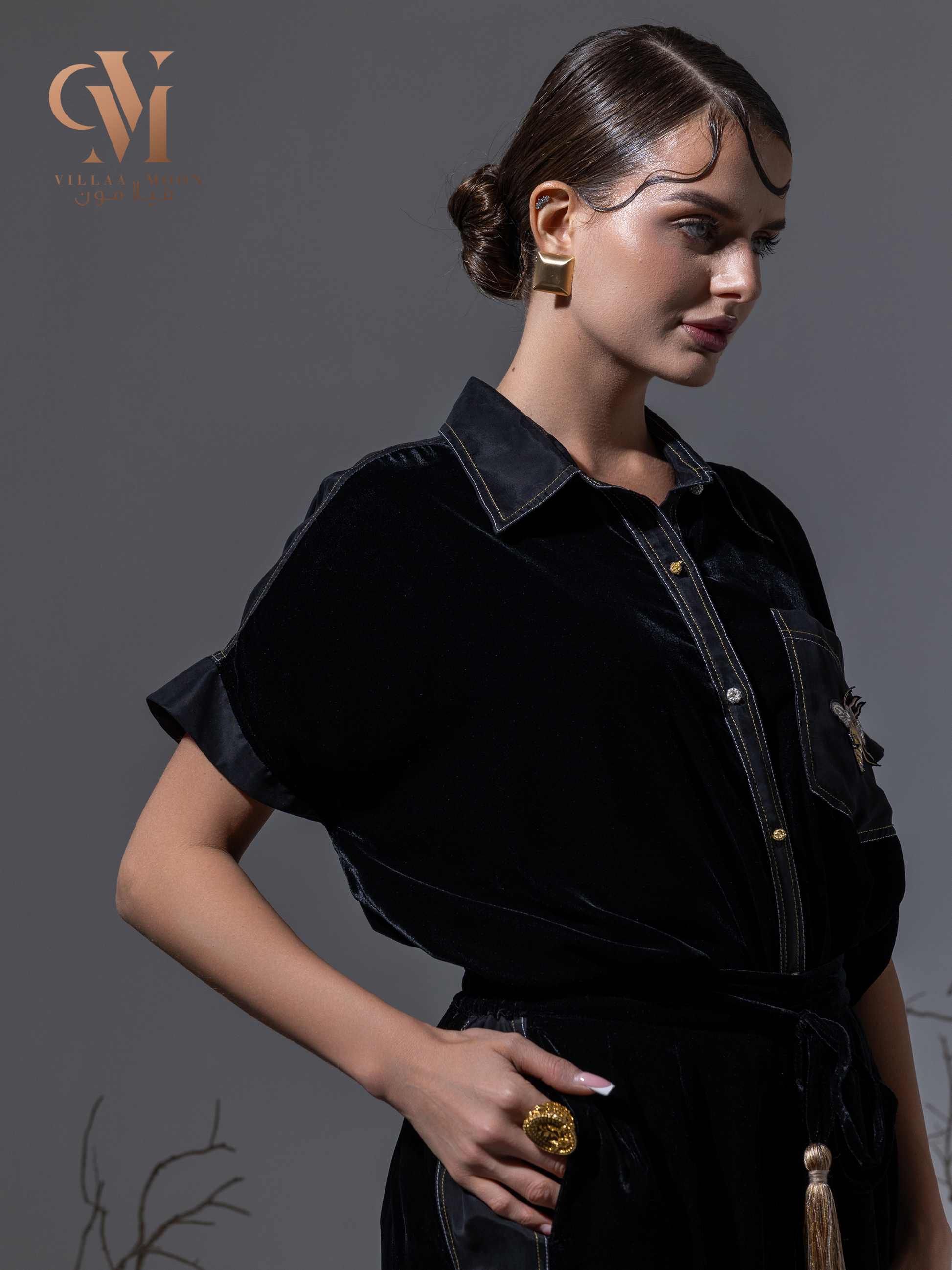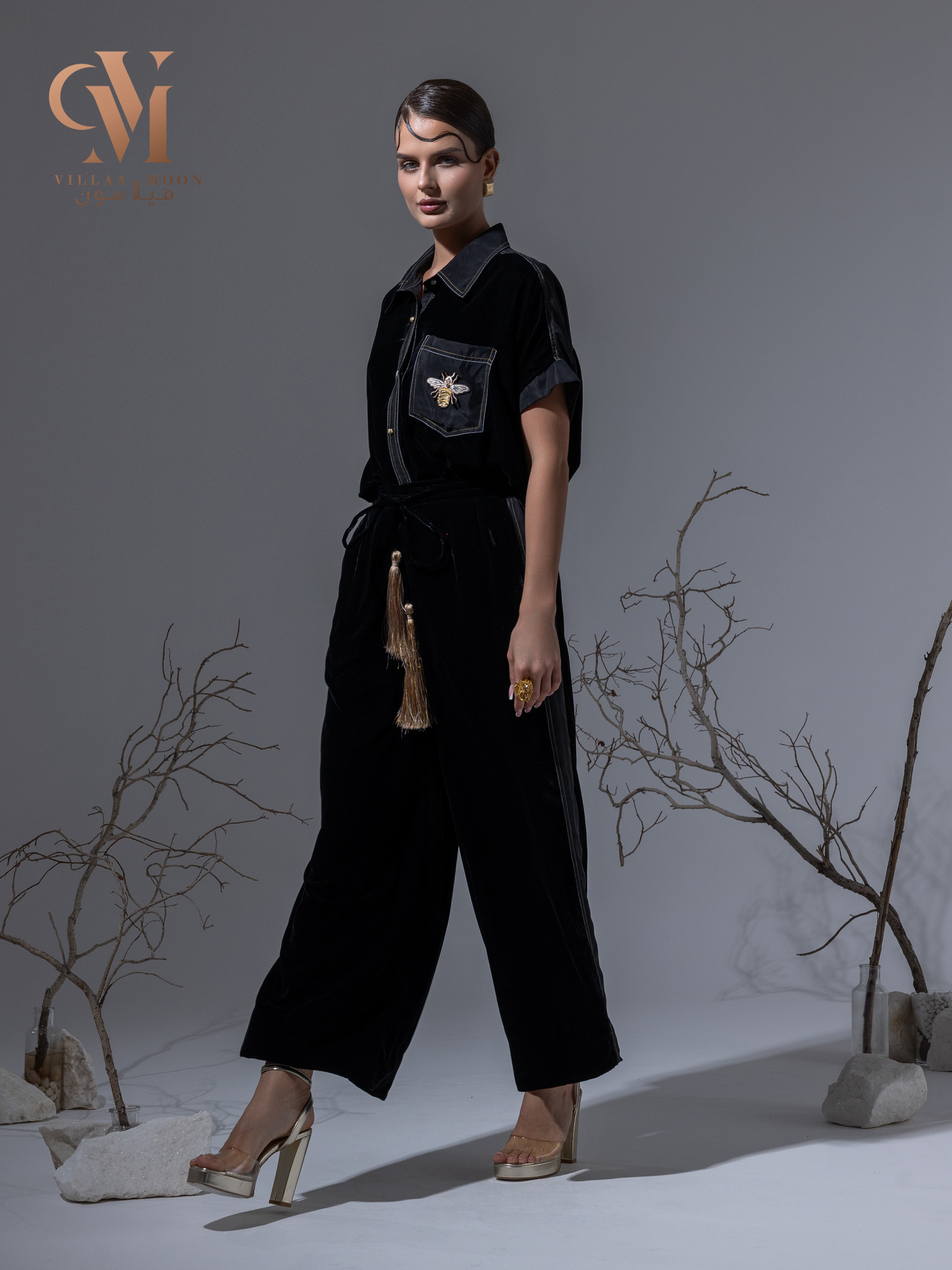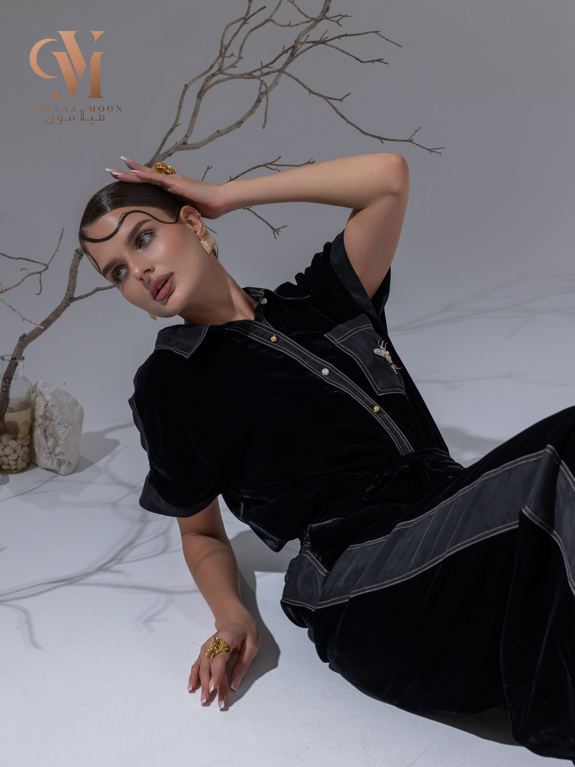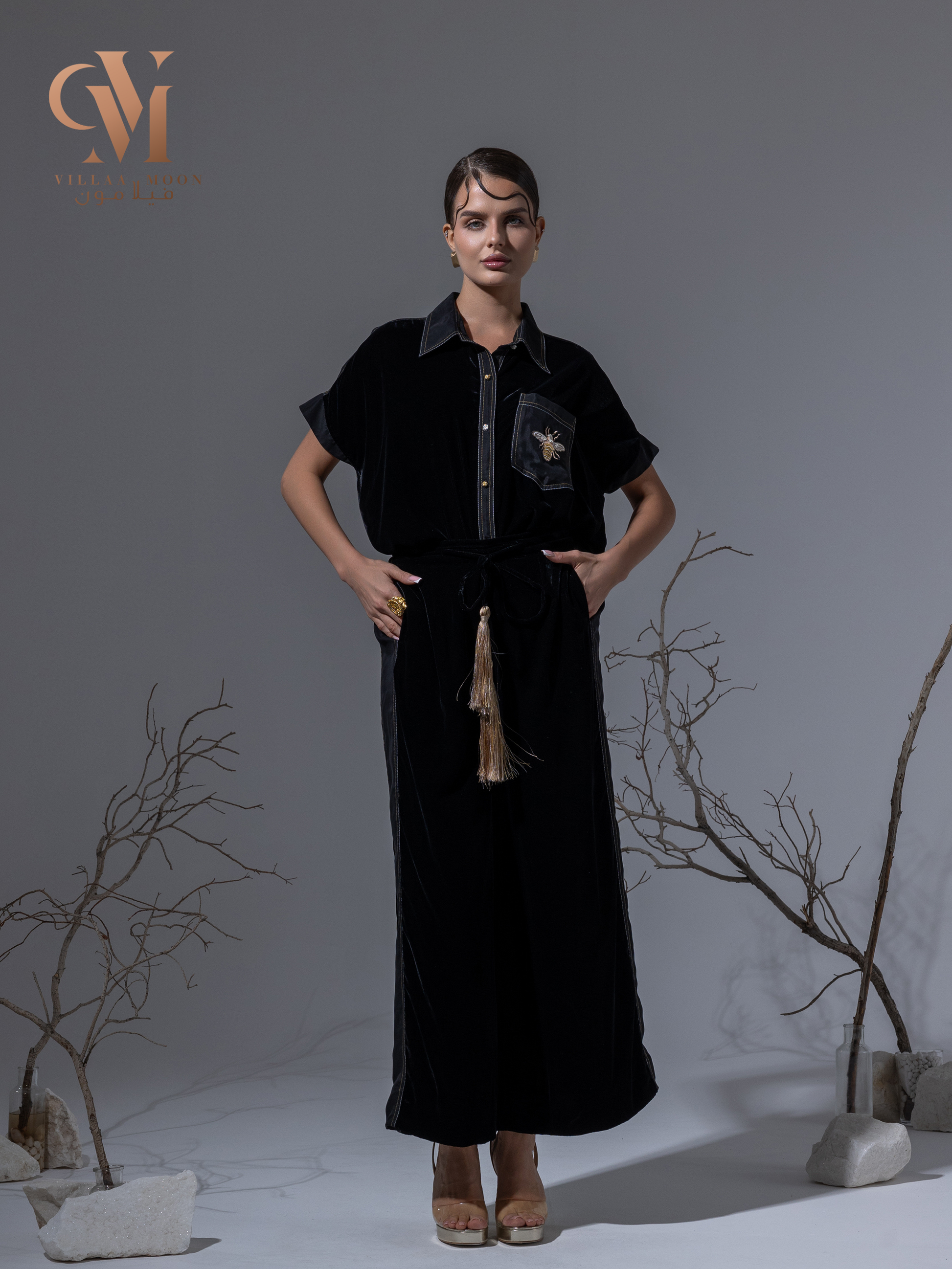 تصميم مودرن مخمل وحرير مغسول اللون الأسود متميز بالتطريز الذهبي والفضي والحزام كركوشه صناعه يدوية خاصه بنا