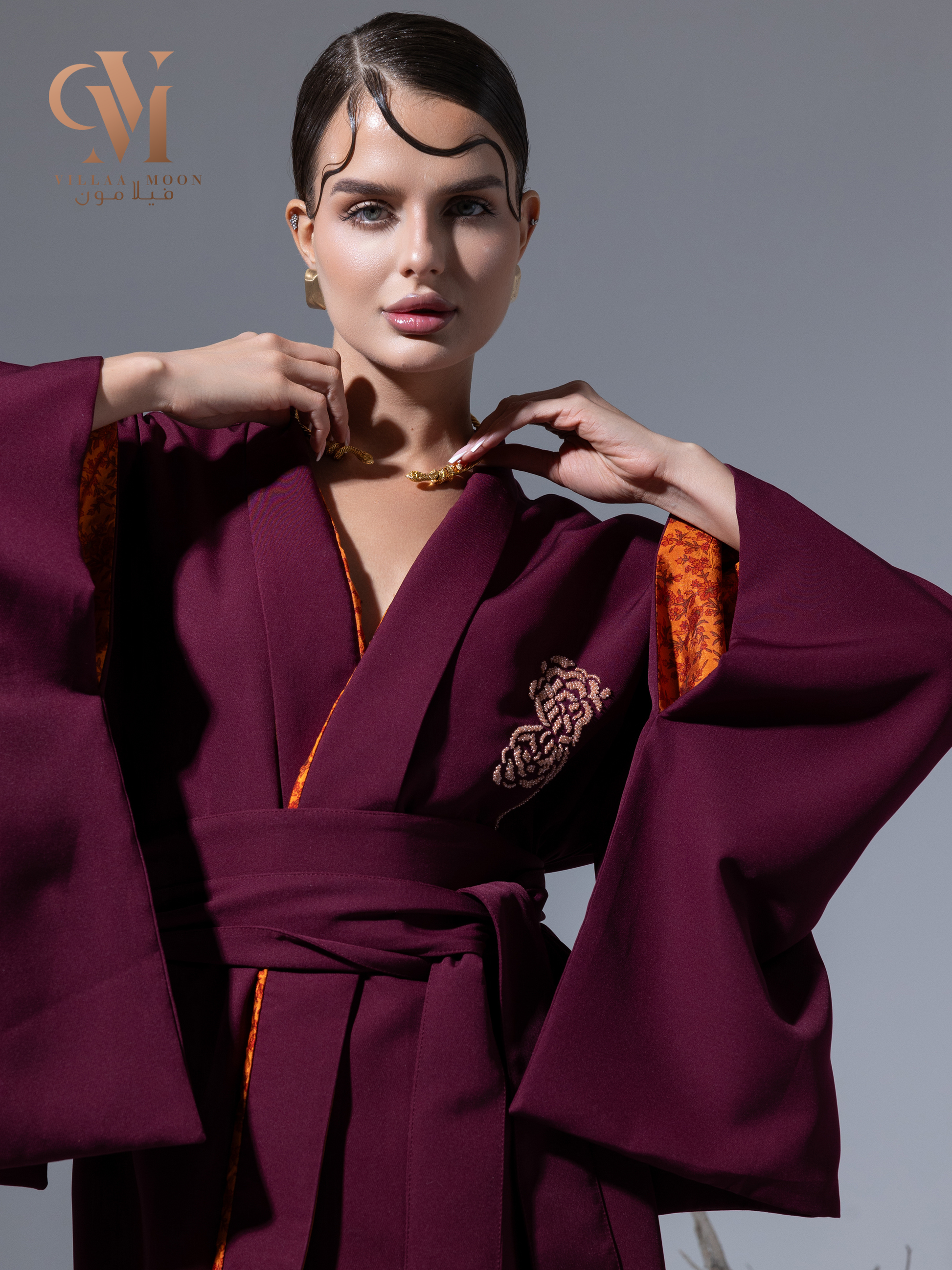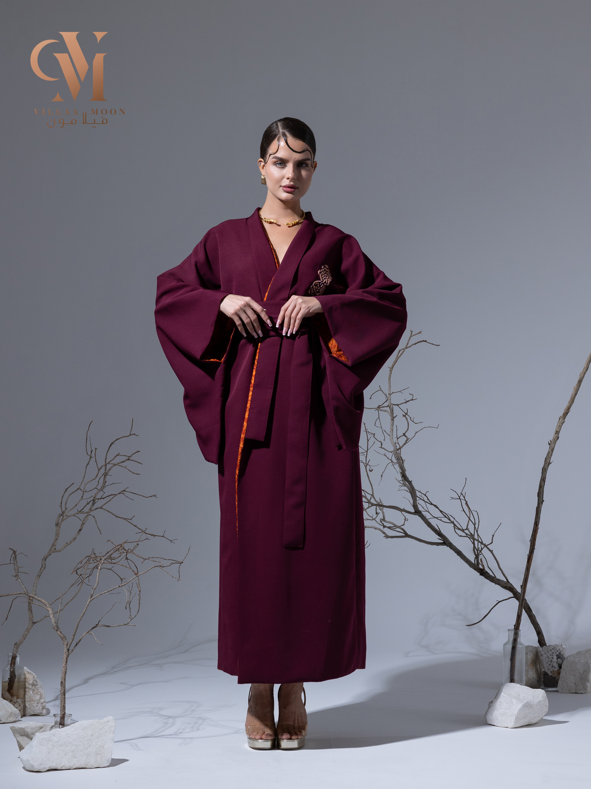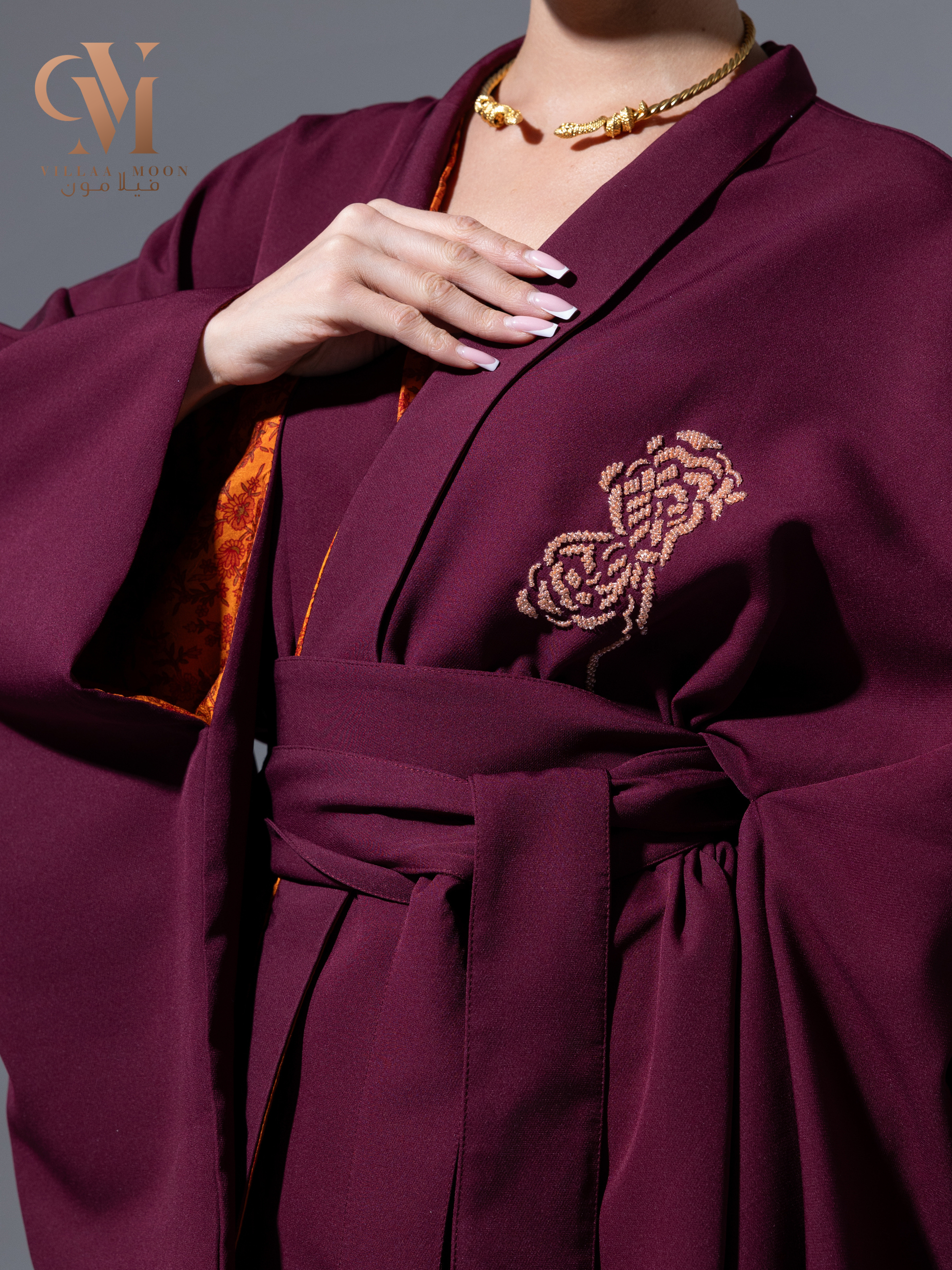 كيمونو عنابي مبطن بالقماش الحرير مع تطريز نمنم على الصدر