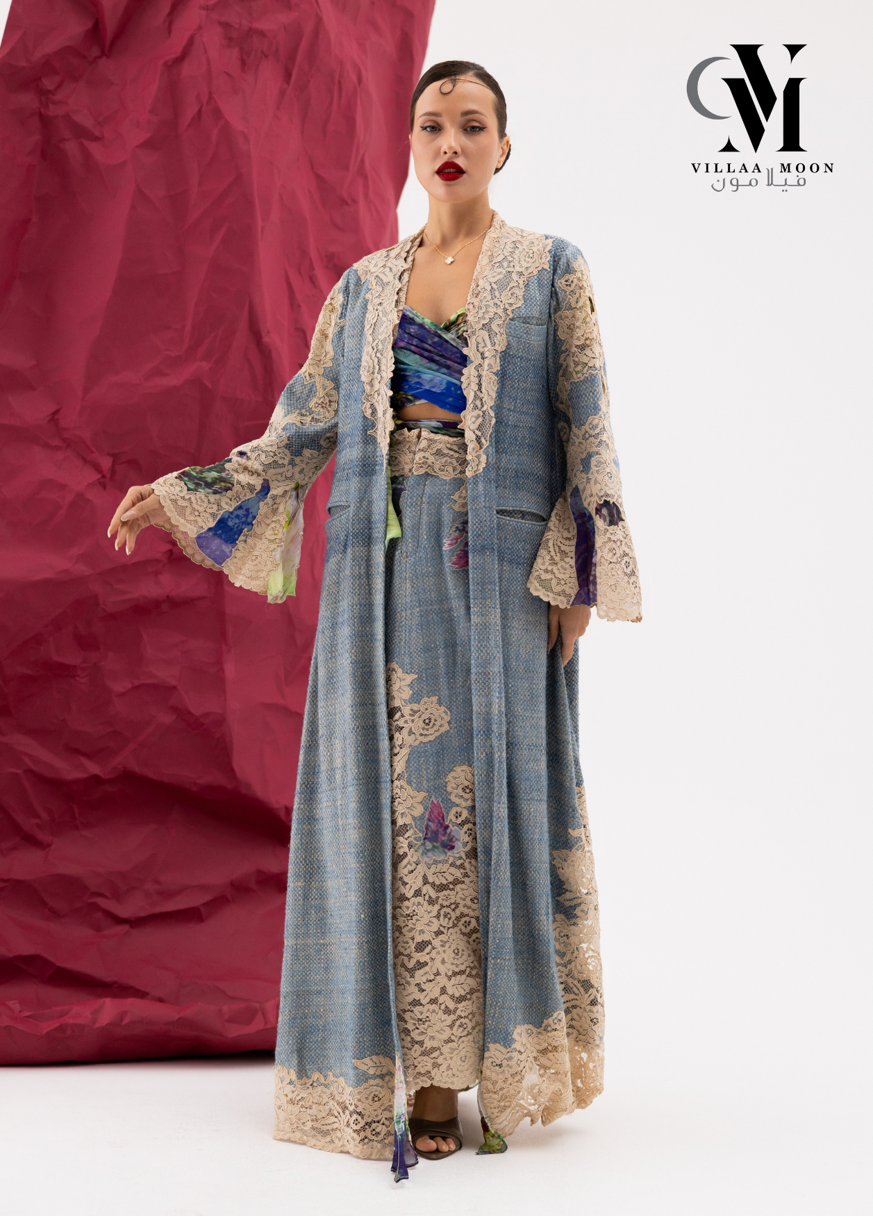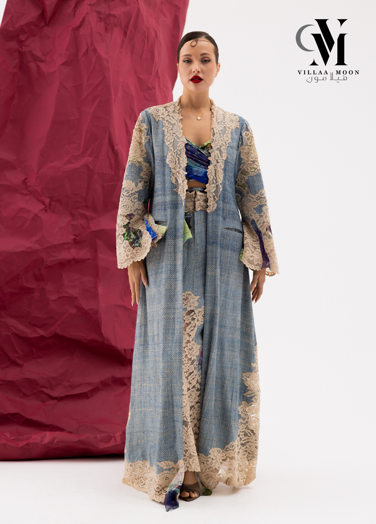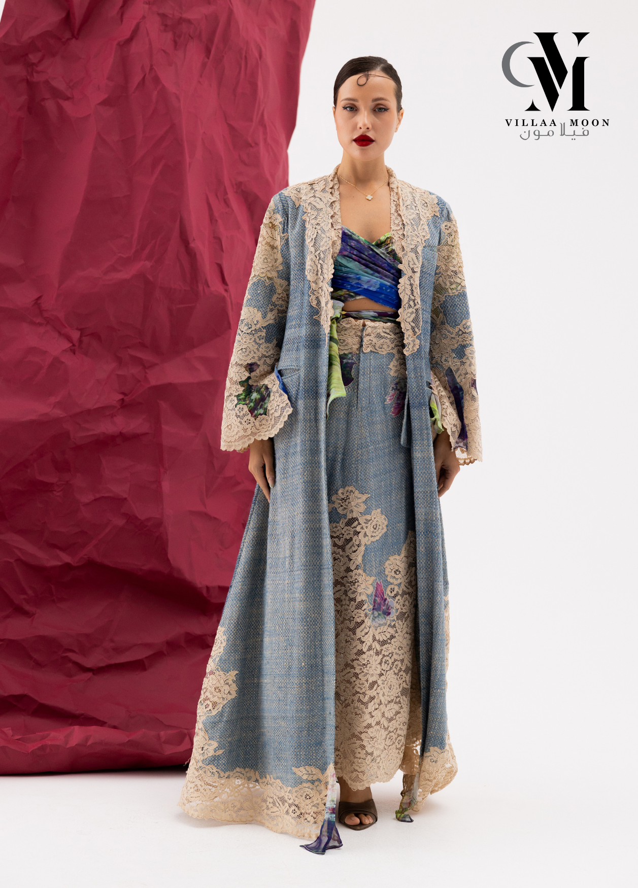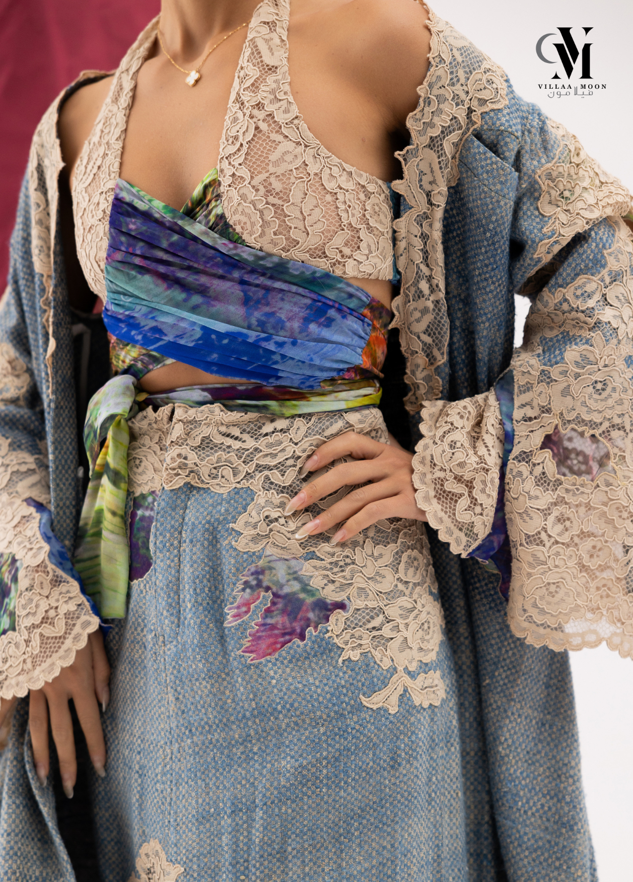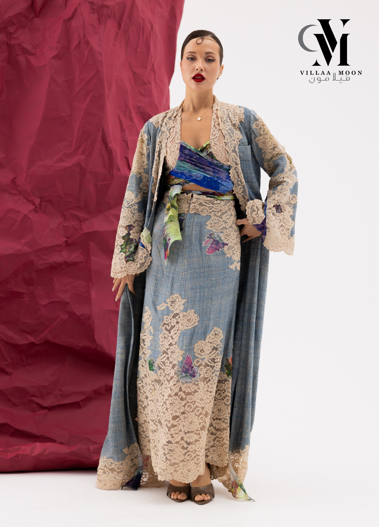عباره عن بدلة مكونه من تنوره مشغوله بالدانتيل الفرنسي والشيفون المشجر مع بدي وجاكيت طويل والقماش الأساسي للبدله من التريكوشانيل