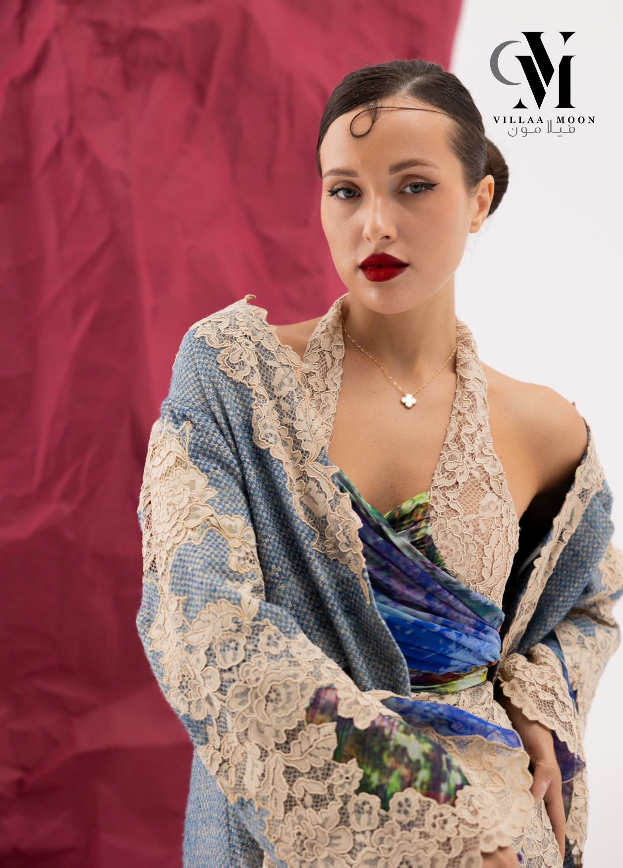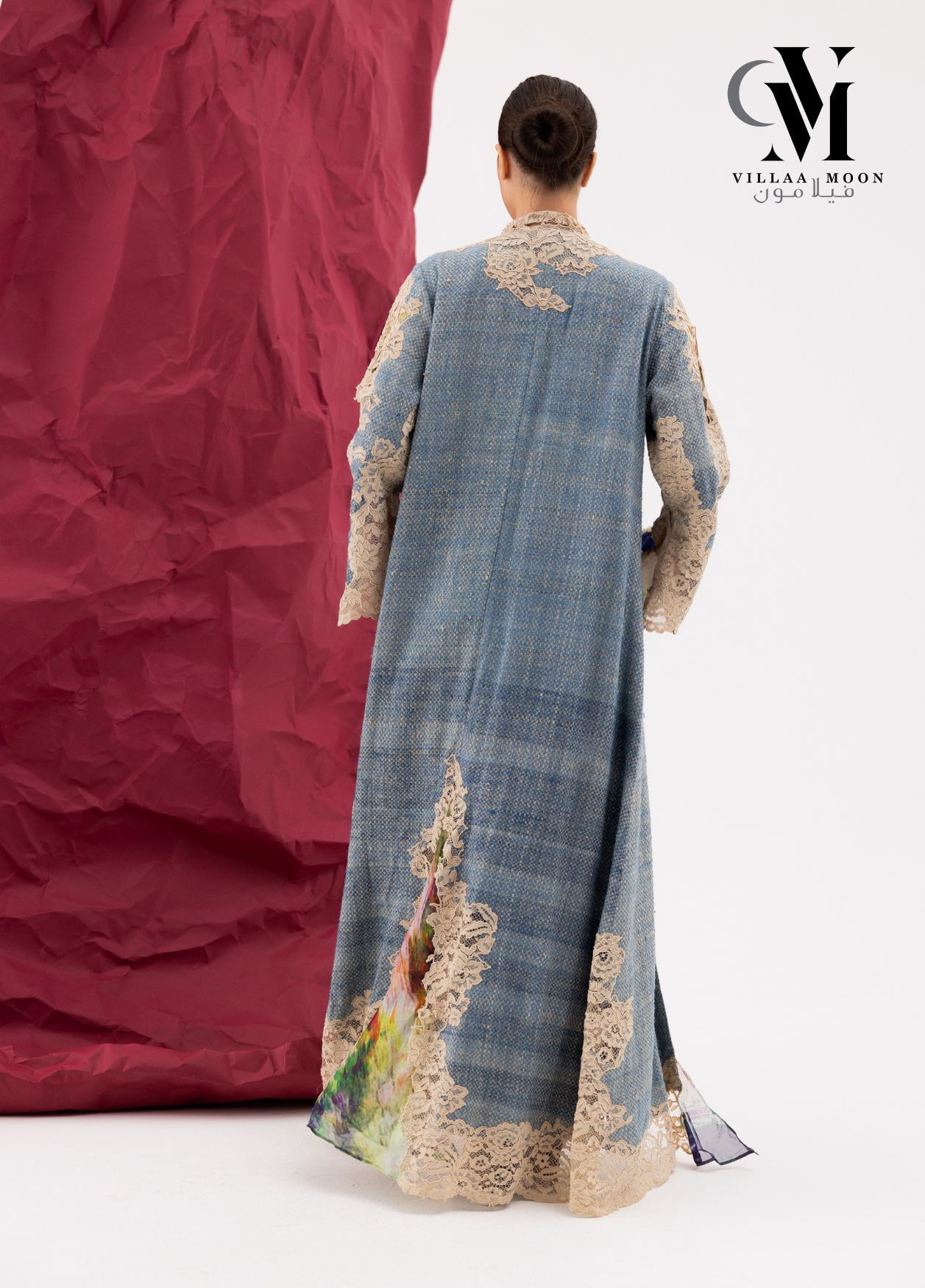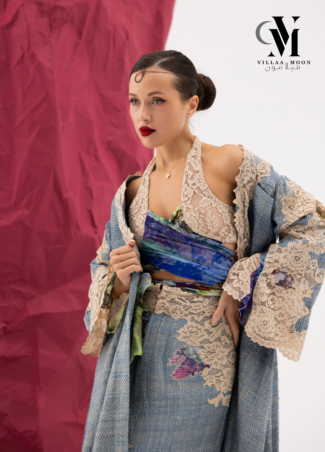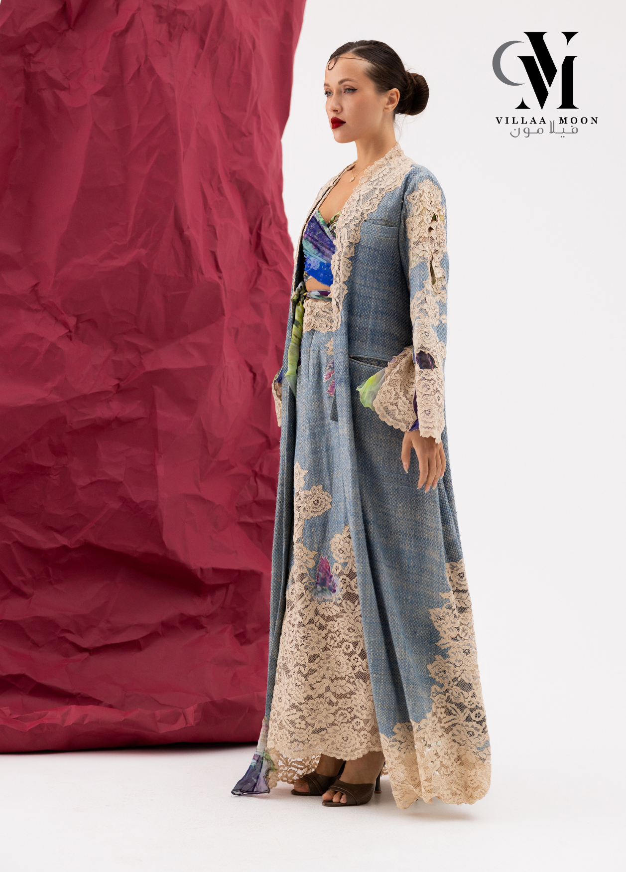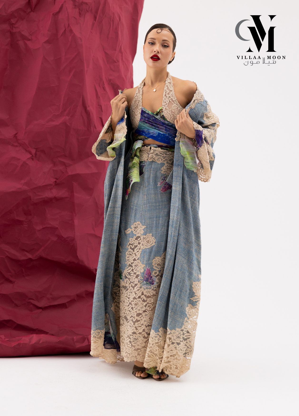 عباره عن بدلة مكونه من تنوره مشغوله بالدانتيل الفرنسي والشيفون المشجر مع بدي وجاكيت طويل والقماش الأساسي للبدله من التريكوشانيل