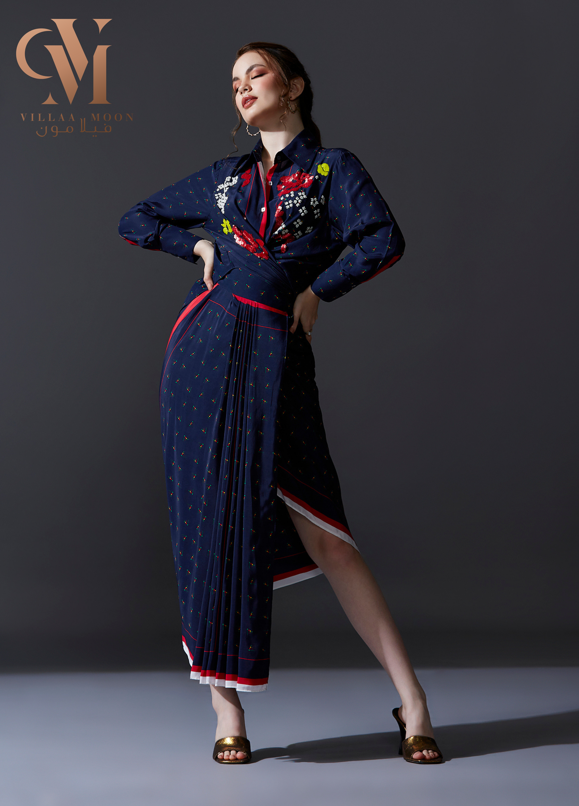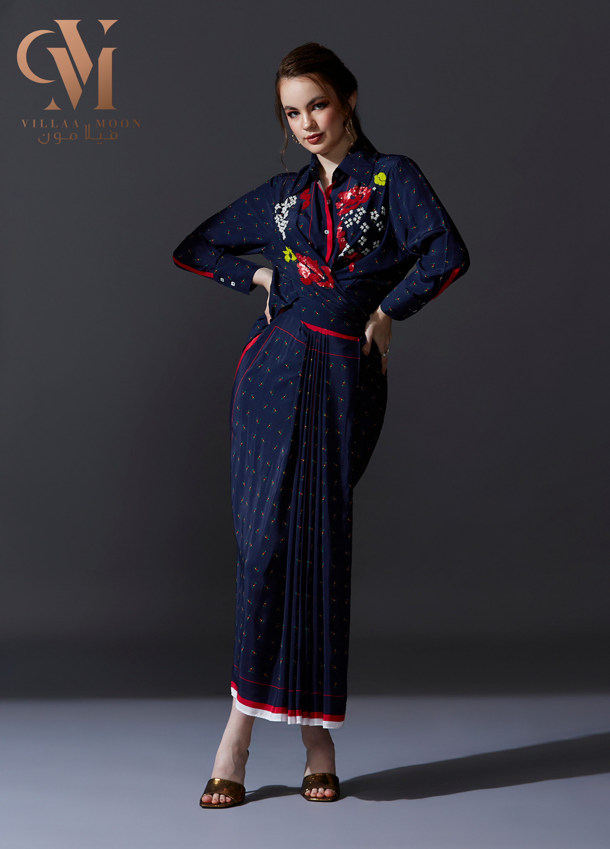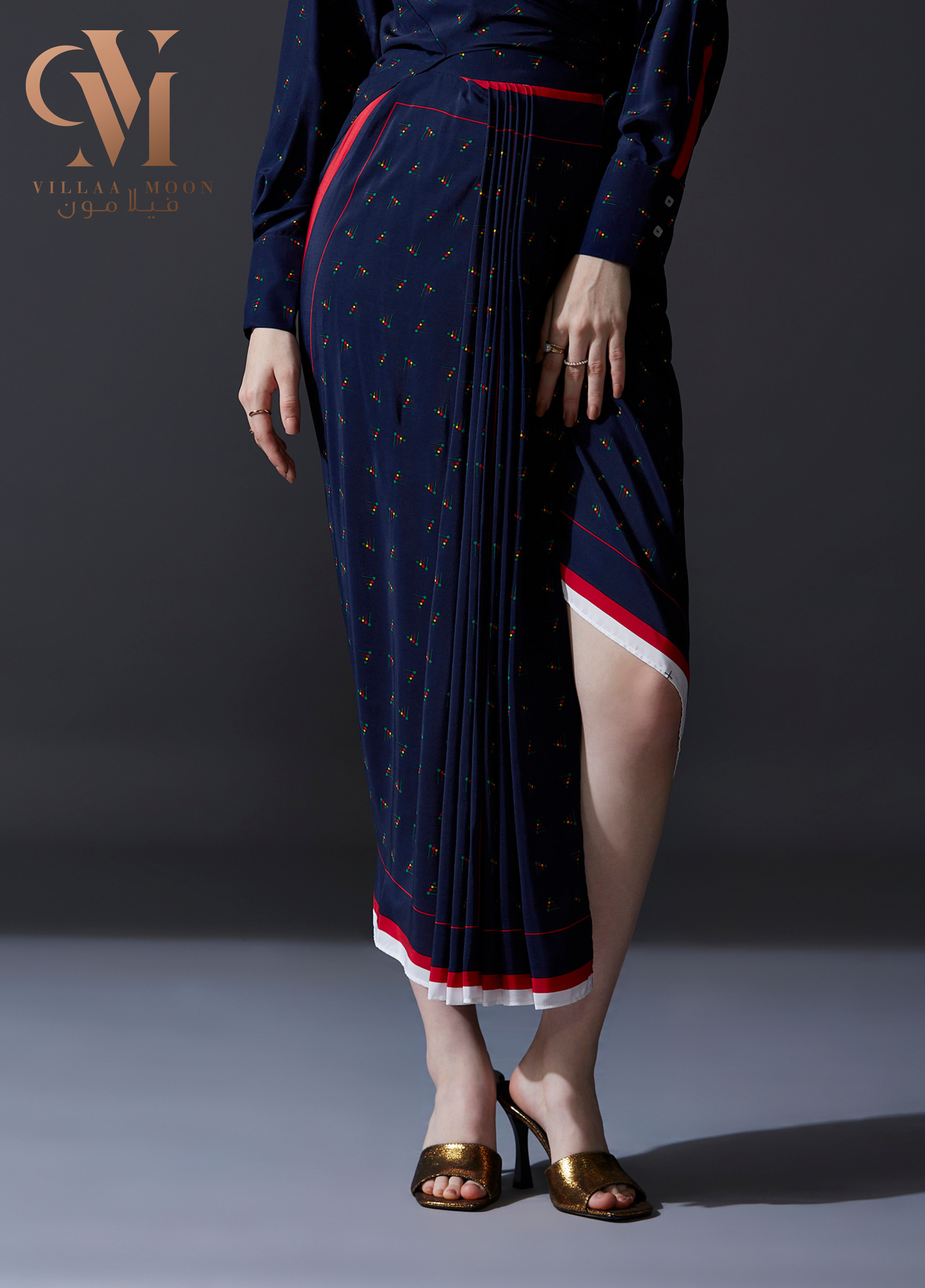 بدلة تنورة كسرات ستايل هندي مع قميص لف مشغول على الصدر بشك ناعم بالنمنم والترتر يضيف عليها لمسات جمالية تجعلها اكثر نضارة وبهجة