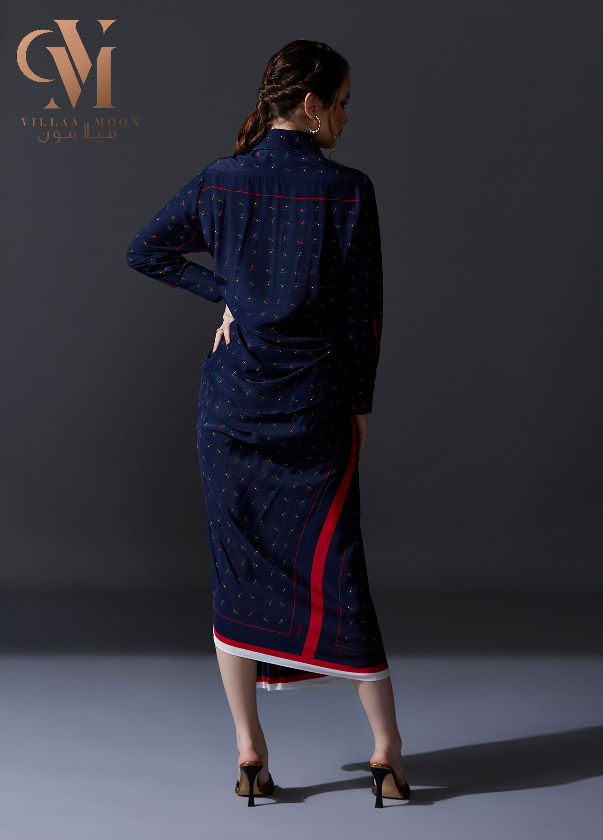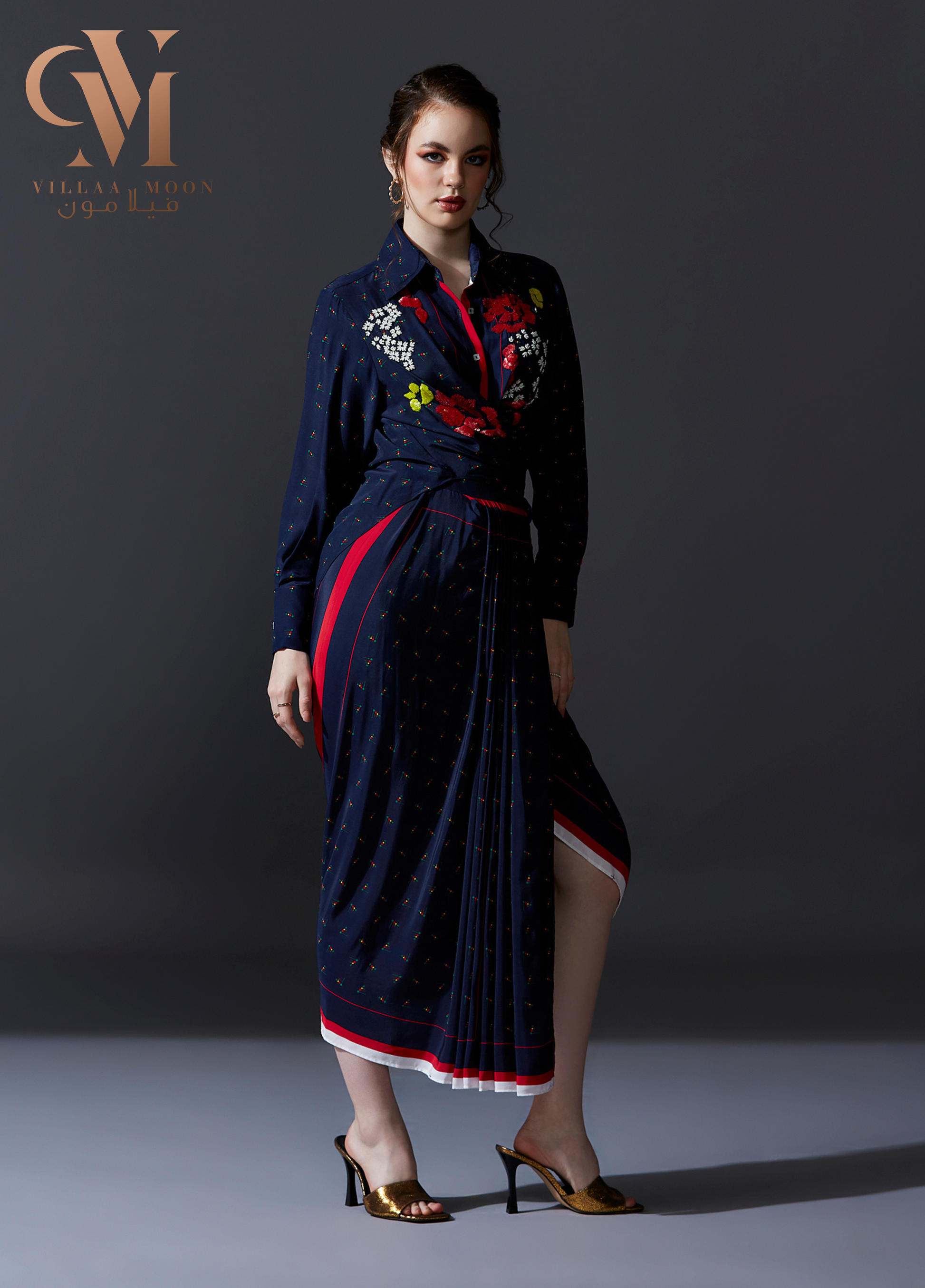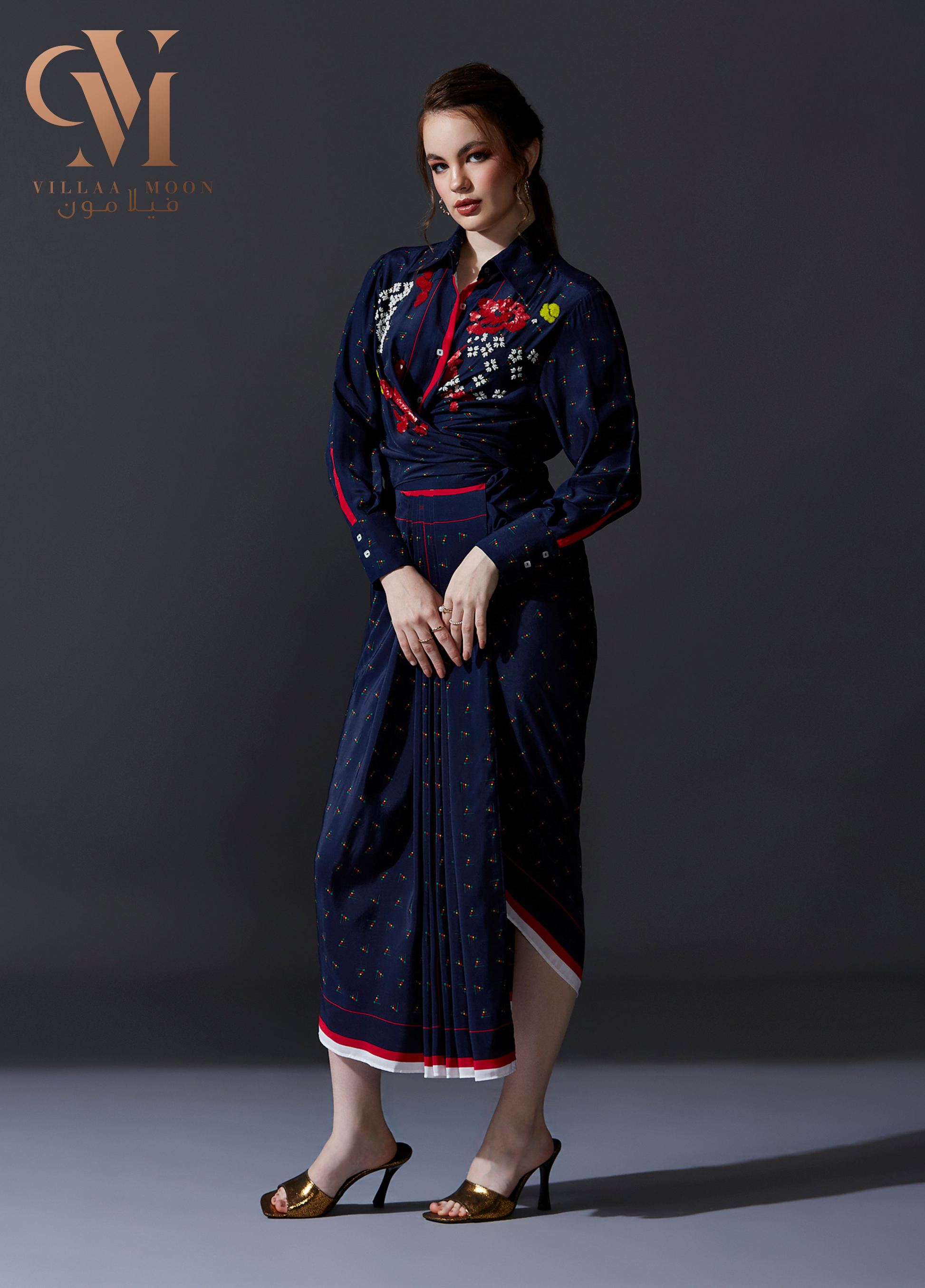 بدلة تنورة كسرات ستايل هندي مع قميص لف مشغول على الصدر بشك ناعم بالنمنم والترتر يضيف عليها لمسات جمالية تجعلها اكثر نضارة وبهجة