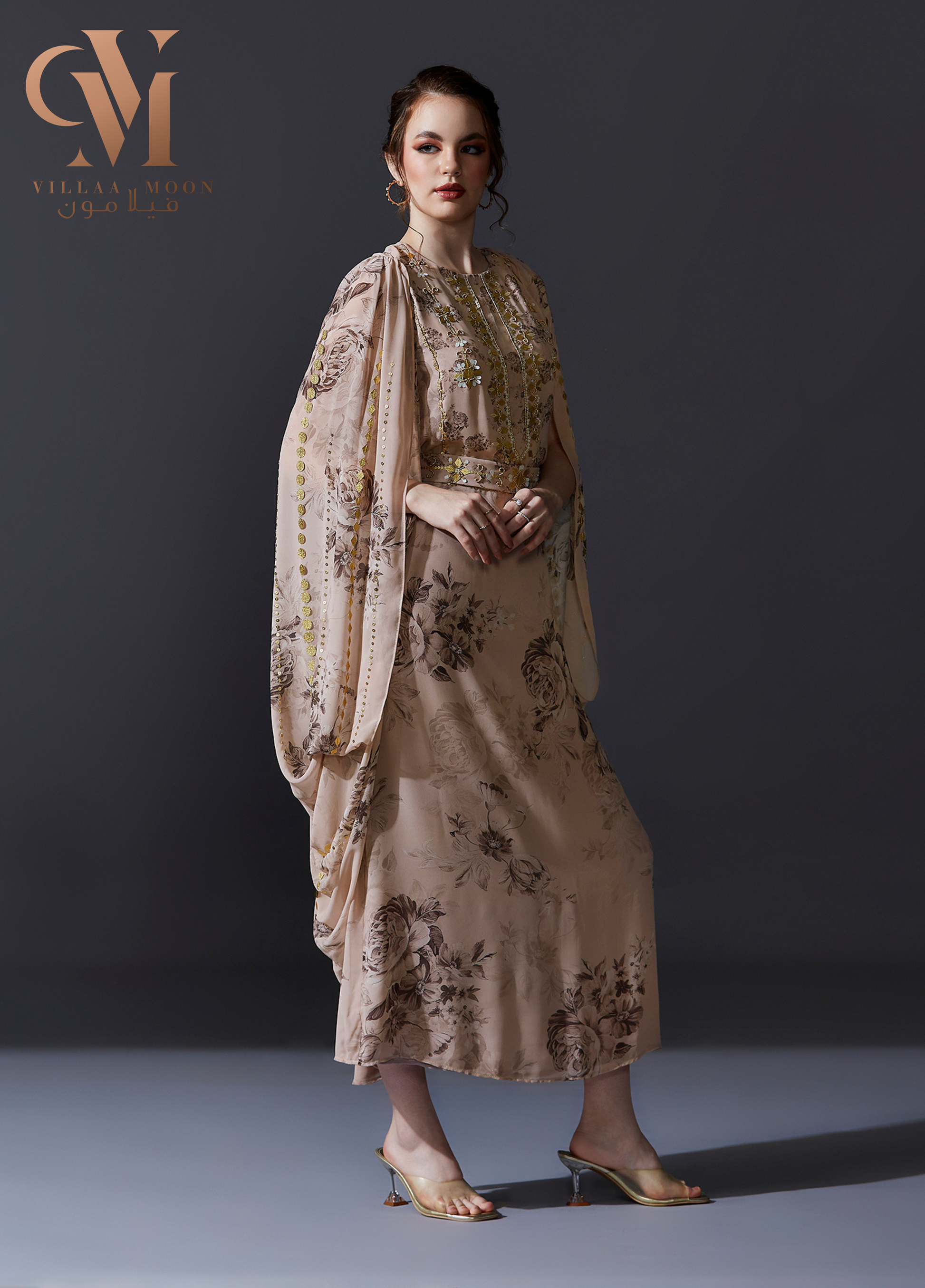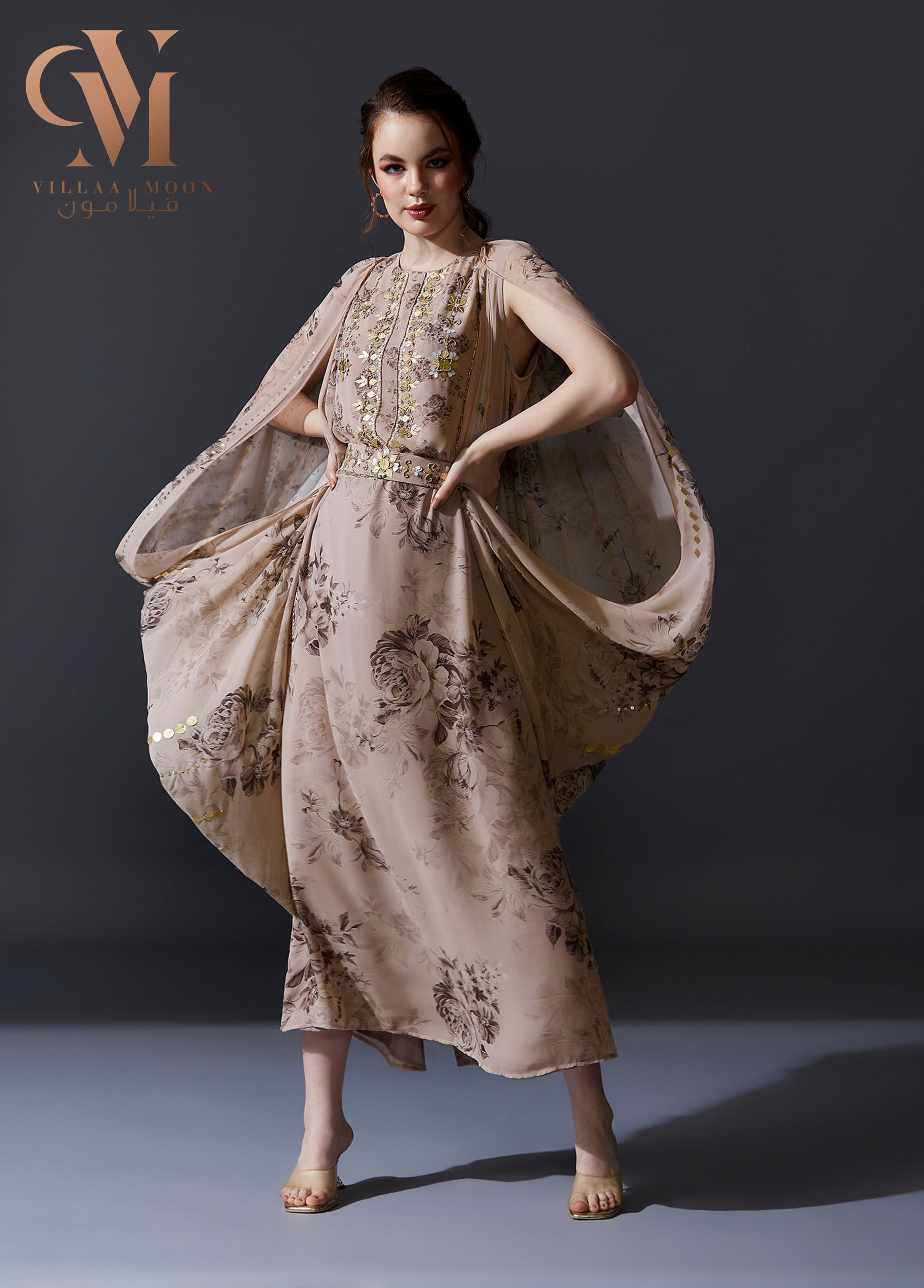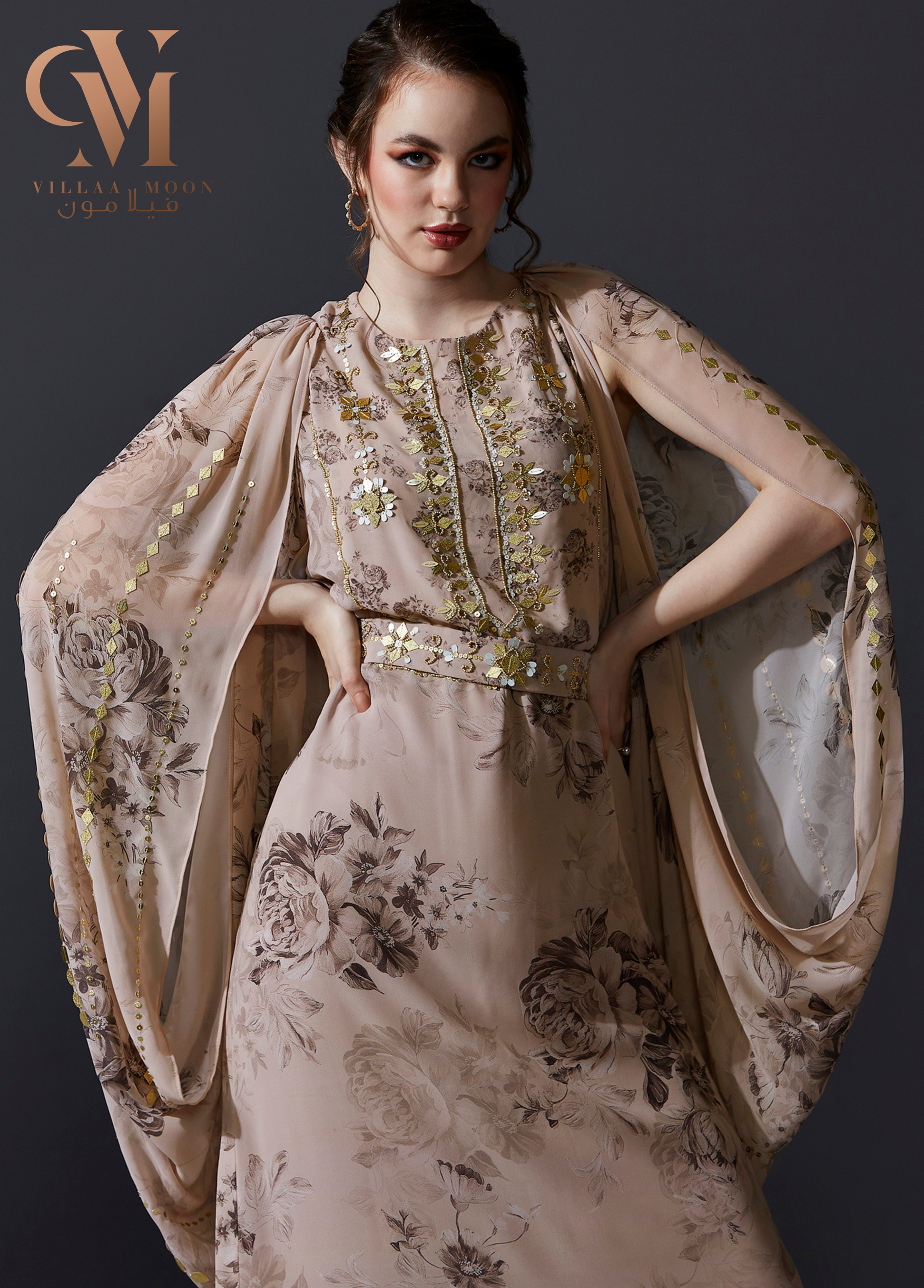 من القماش الشيفون عباره عن قطعتين كيب وفيتان داخلي مشغوله بالشك الترتر الخاص بنا بالدبل فيس مع حزام داخلي يجعل من تفاصيل الموديل رسميه فنيه