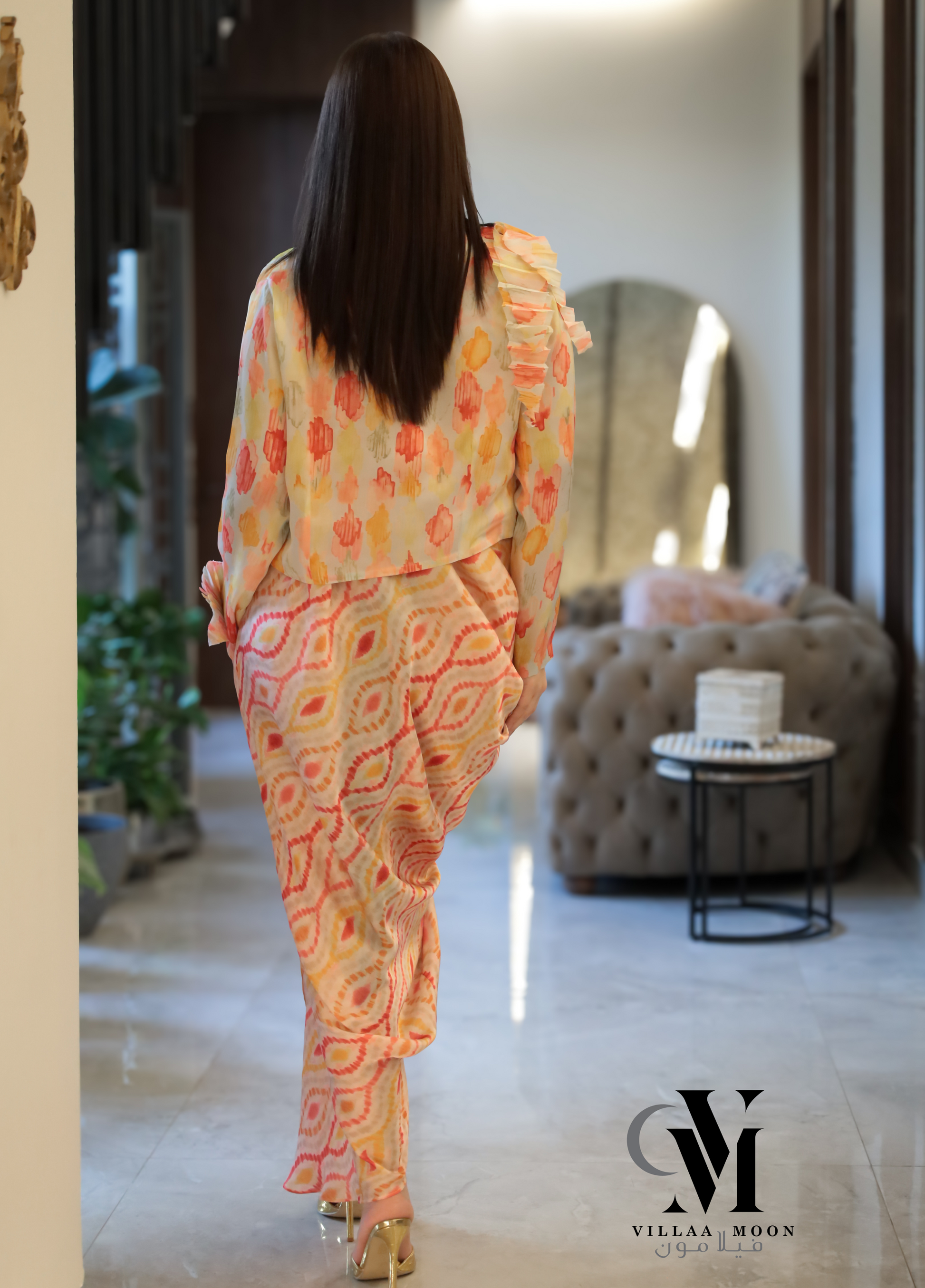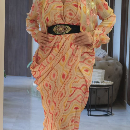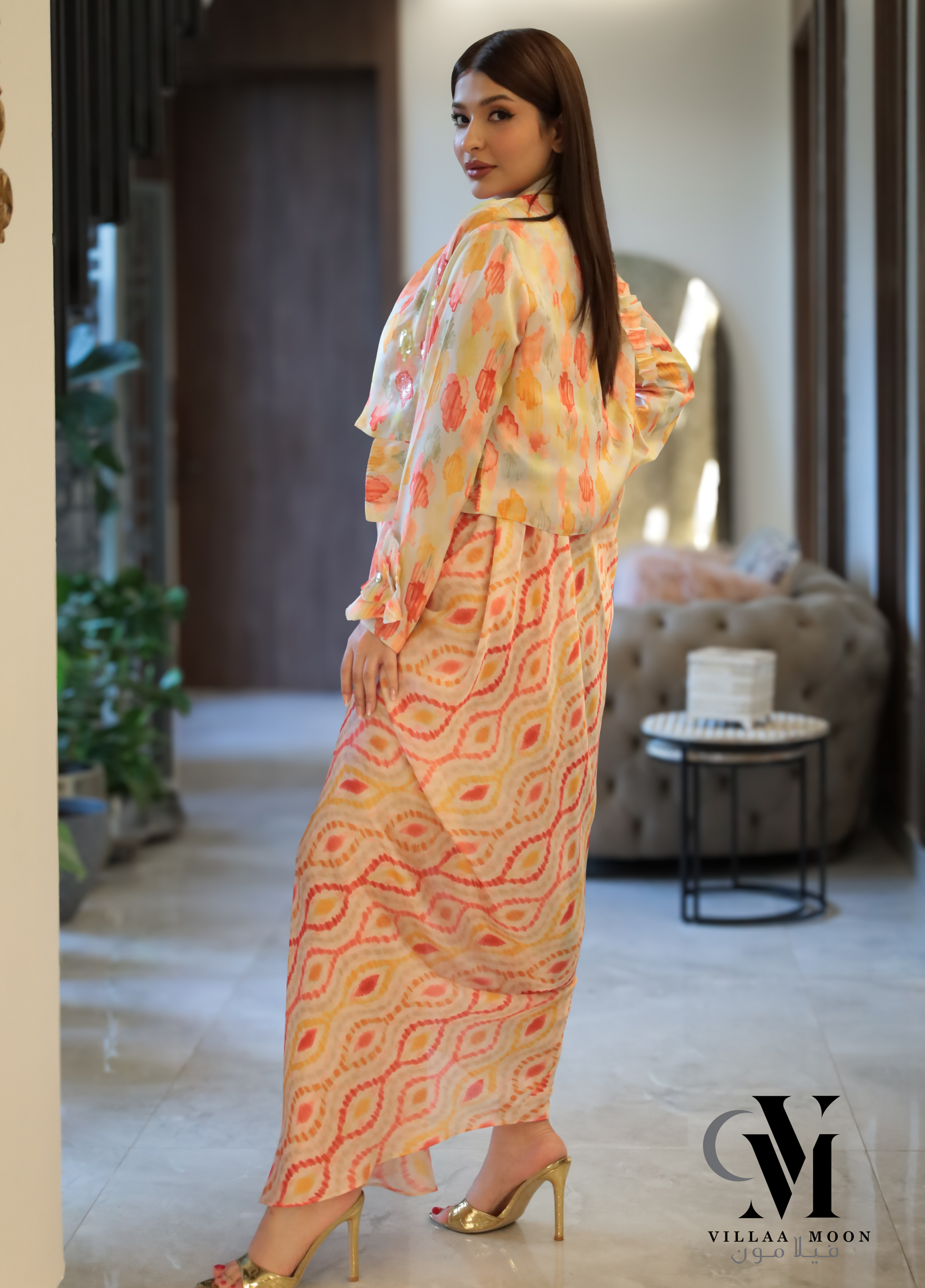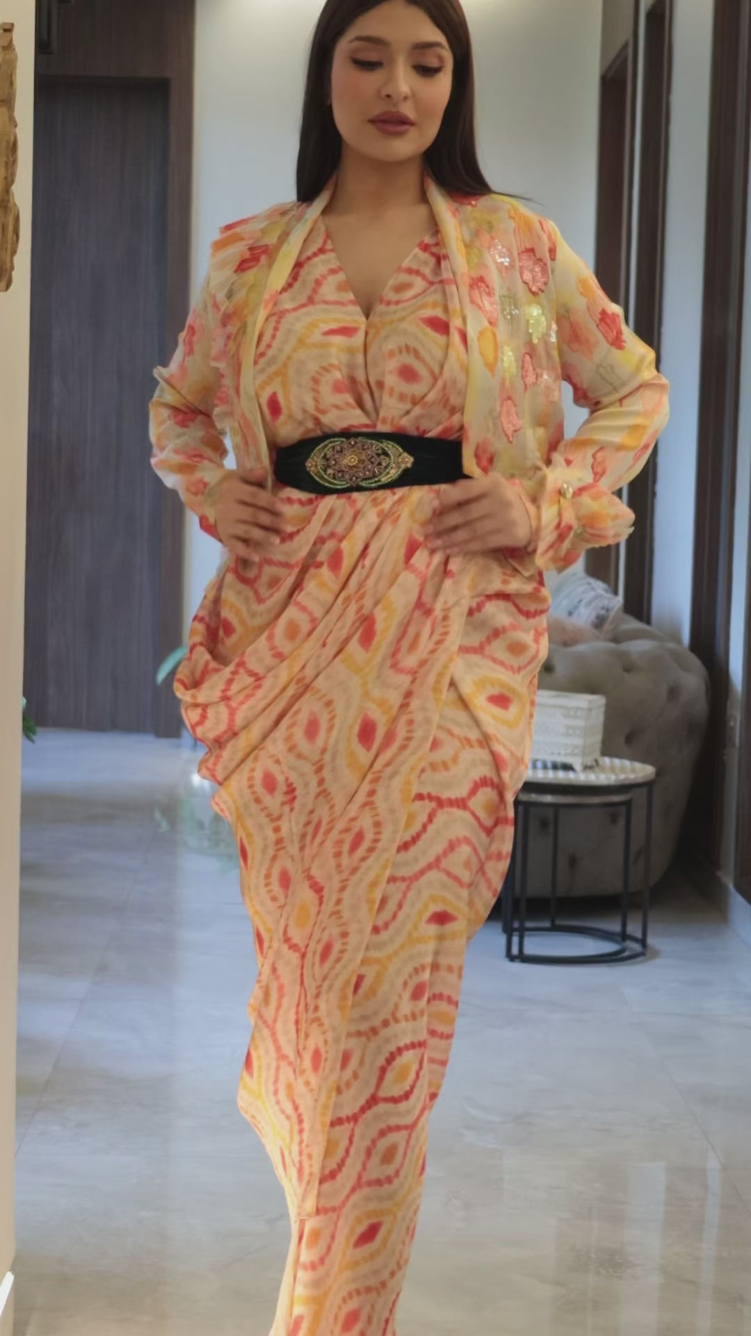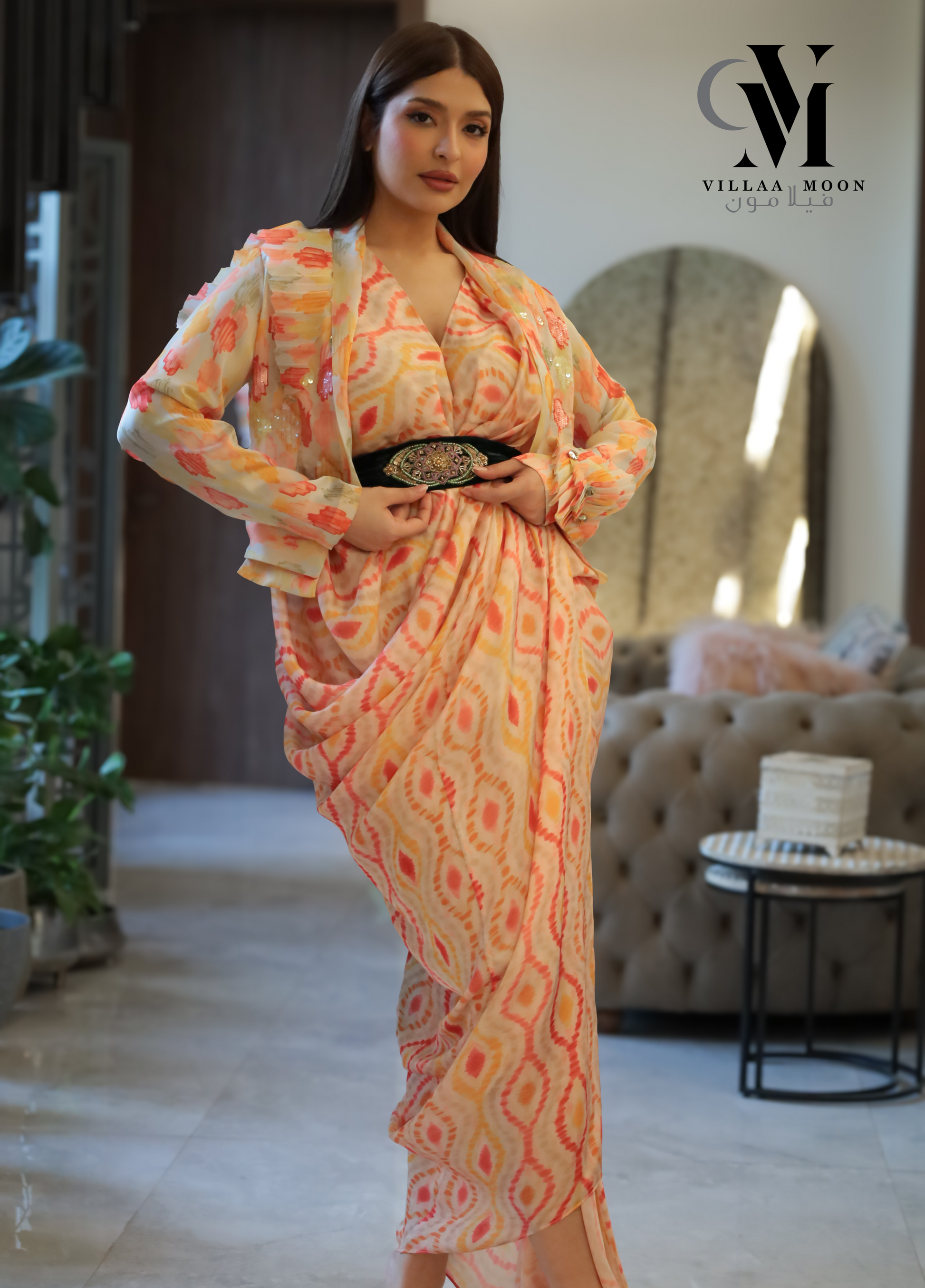 بدله من الحرير عباره عن قطعتين جاكيت قصير وفستان لف مع حزام مخمل مشكوك