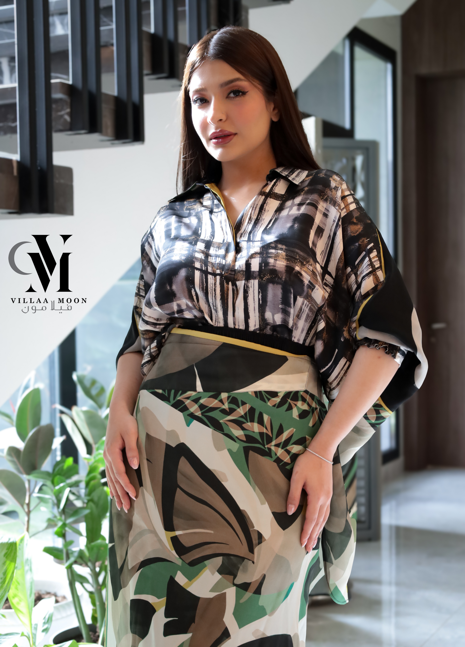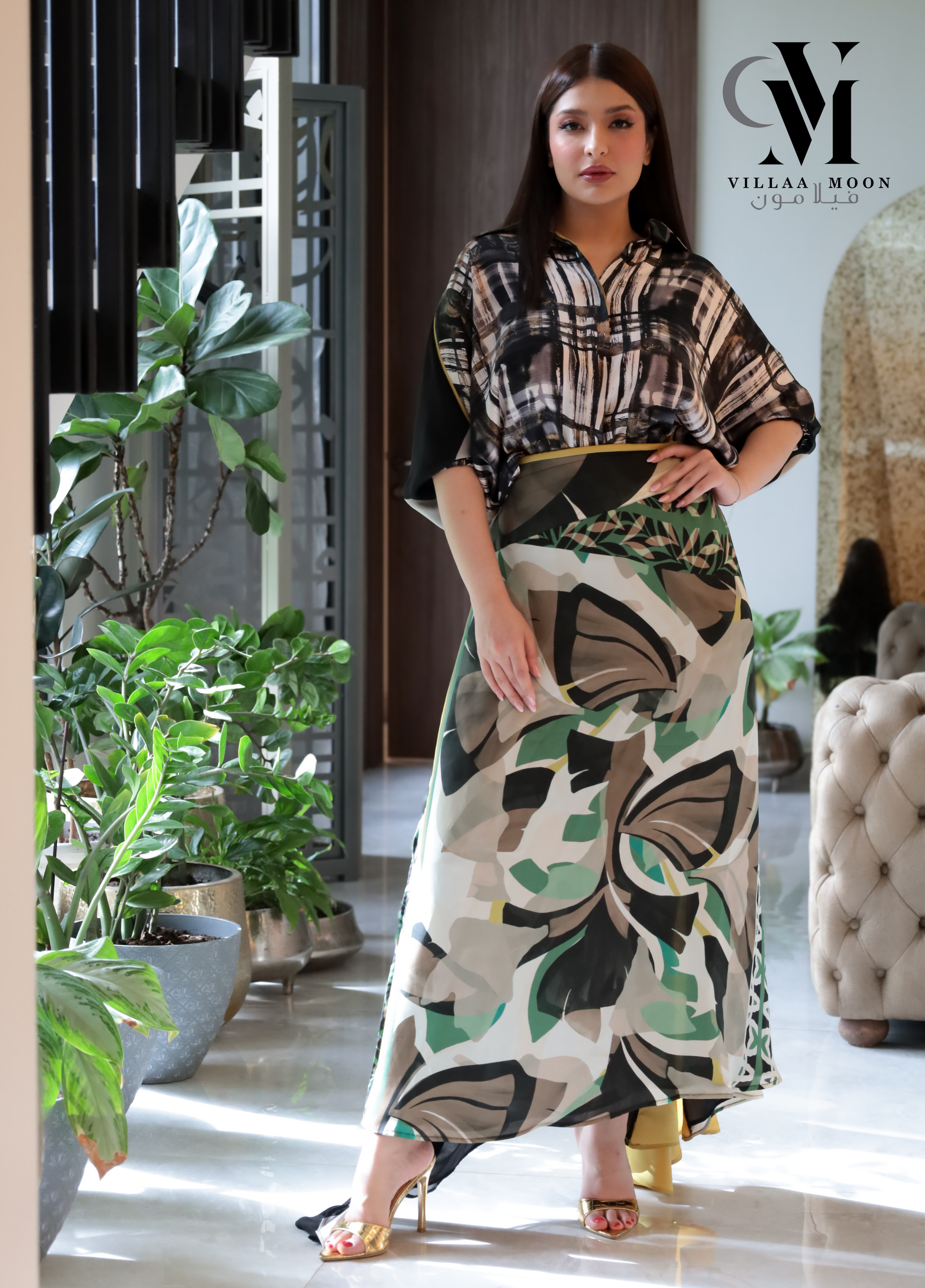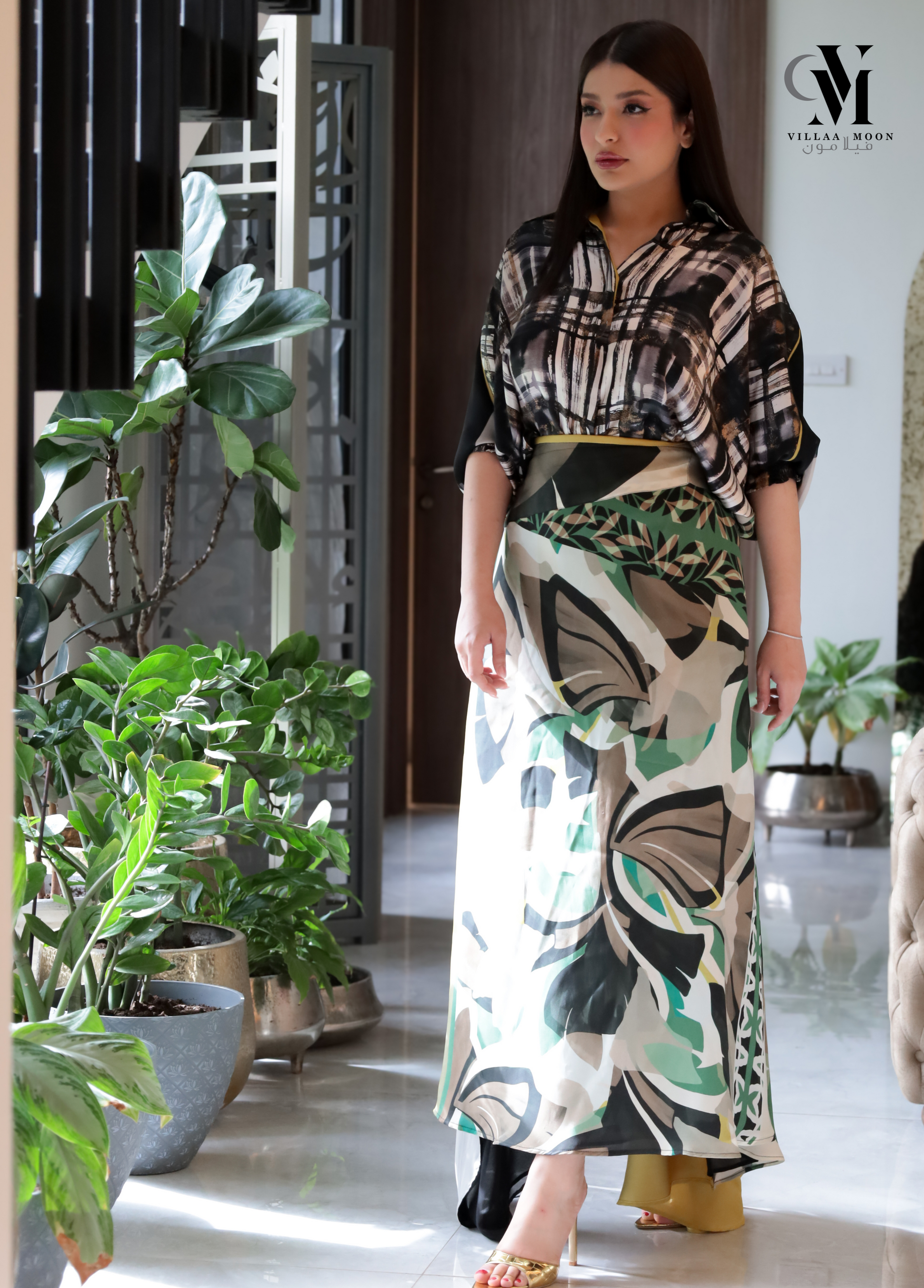 القميص اوفر سايز والتنوره لف من تركيبات لأقمشه من الحرير والشيفون الحرير ذو تناسق لوني بتدرجات اللون الاسود والبني مع الاخضر العشبي واللون الأصفر الماسترد